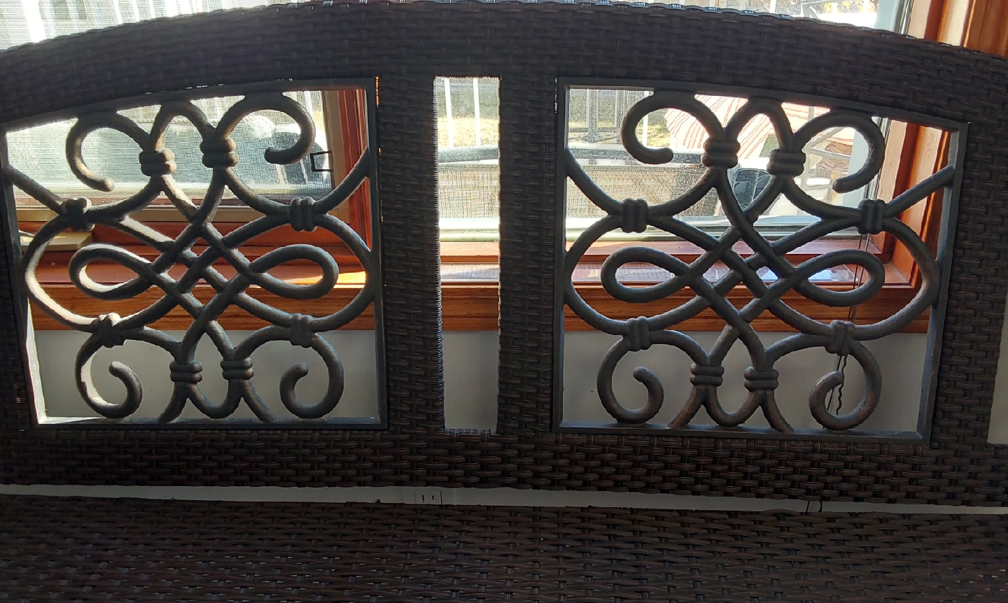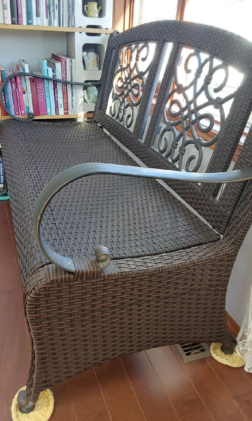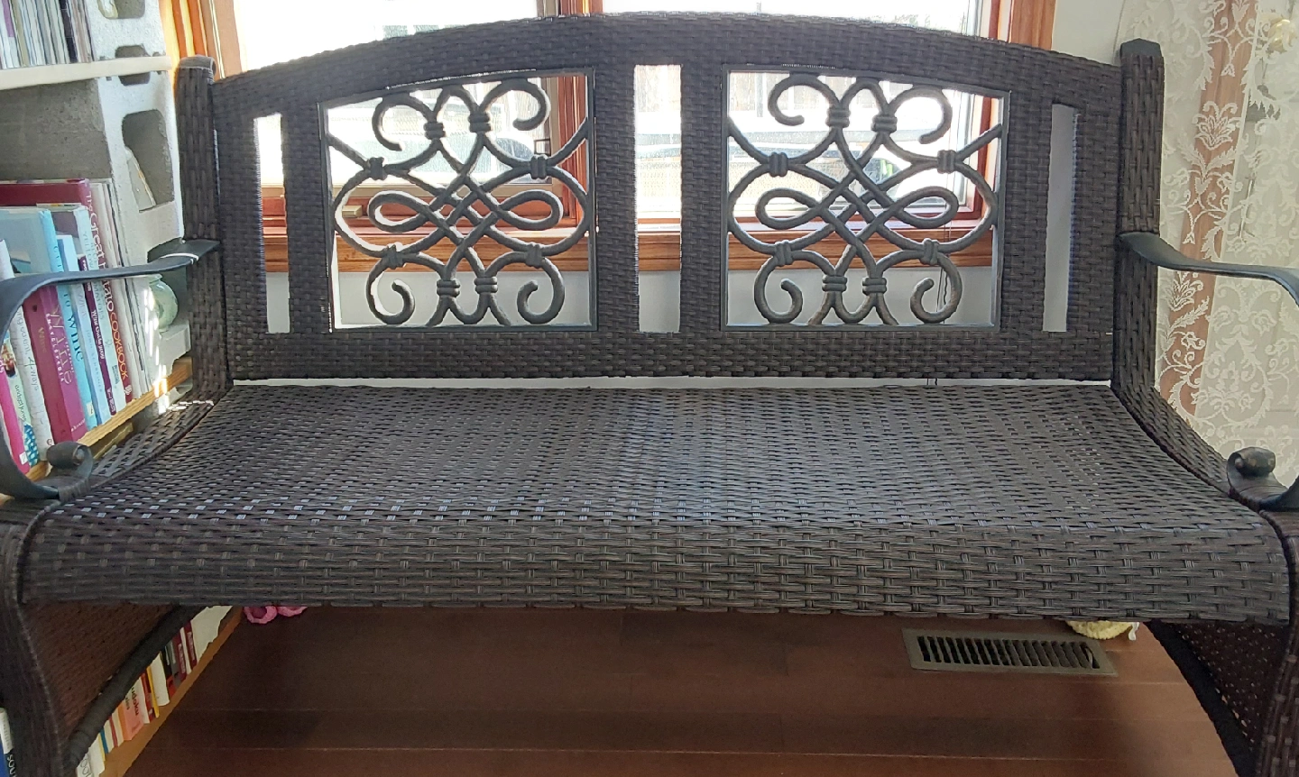 9only used it indoor. Selling a lovely wicker outdoor bench. It's in great condition and perfect for relaxing on your patio or in your garden. The bench features a beautiful woven design and sturdy metal accents, making it both stylish and durable. It’s a great addition to any outdoor space!