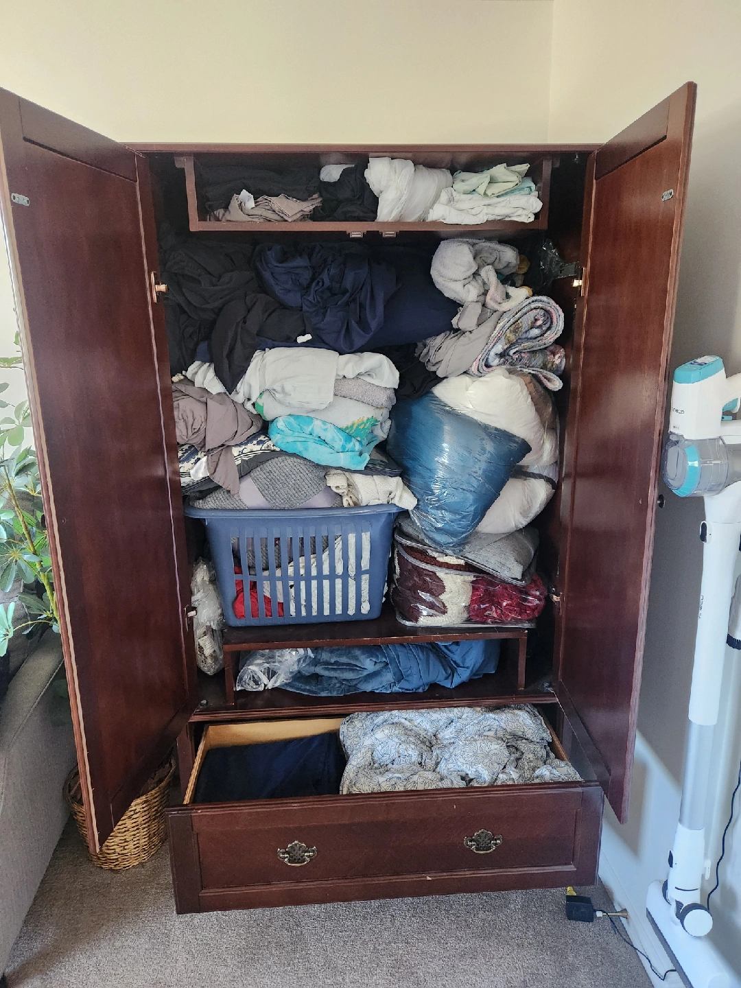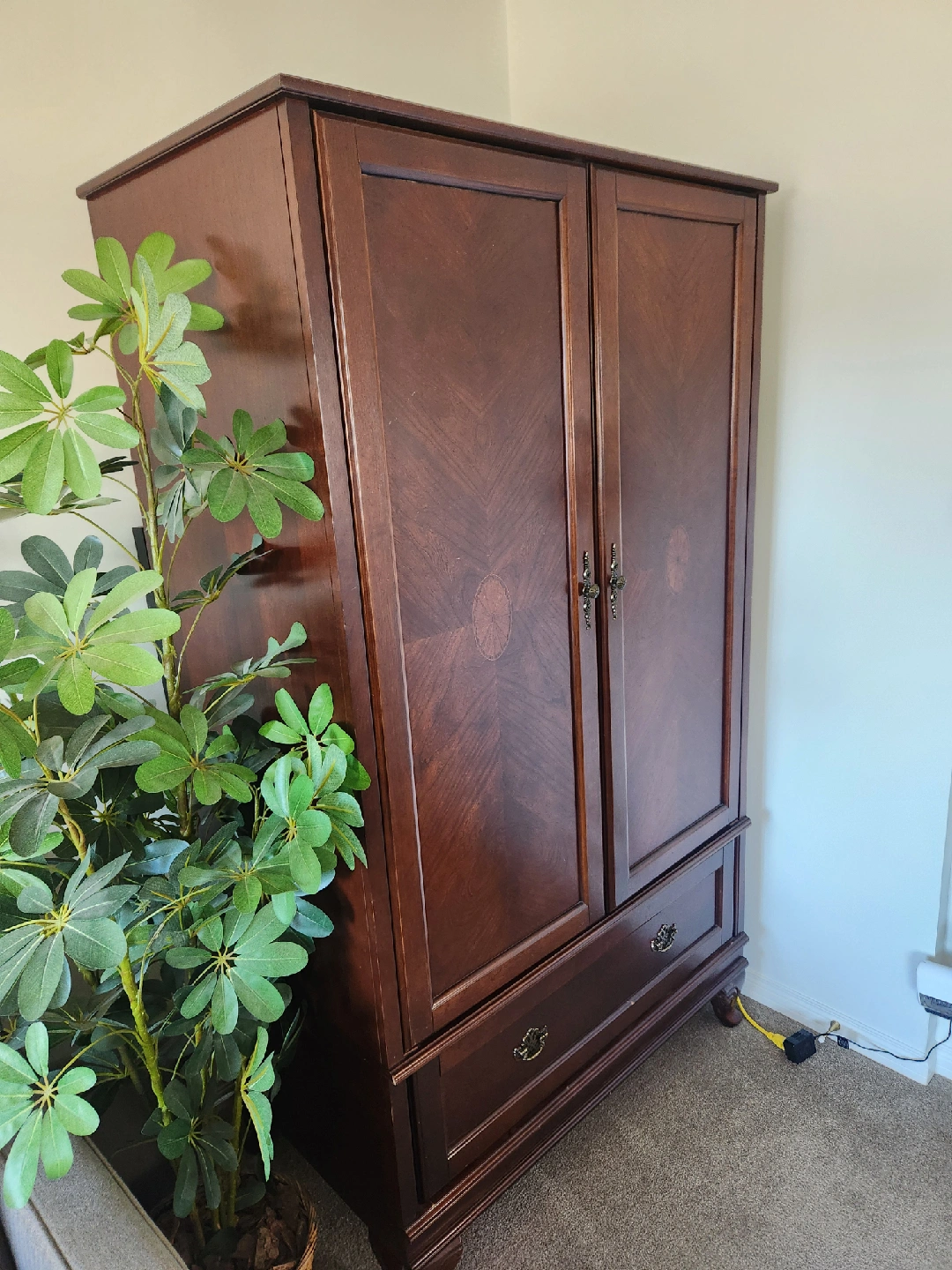 105Selling a lovely wooden armoire. It's a great piece for adding storage to any room. The armoire features a drawer at the bottom and double doors that open to reveal shelving. Perfect for lots of storage! Legs are removable for a more streamlined look. dimensions: 42.25"w x 74"h x 24"d