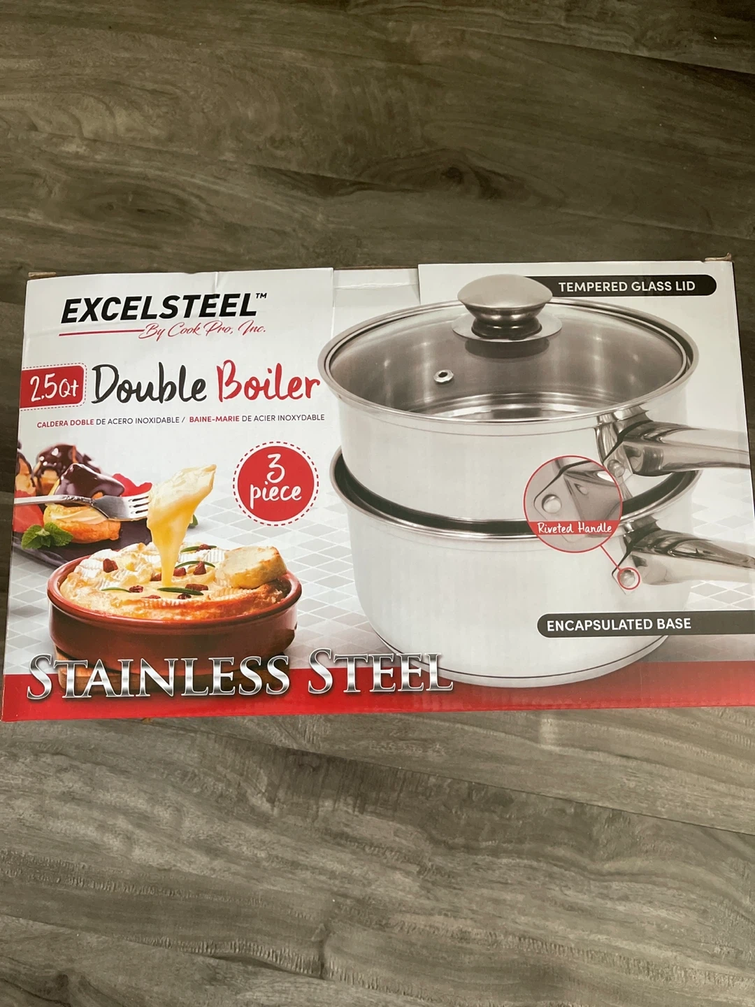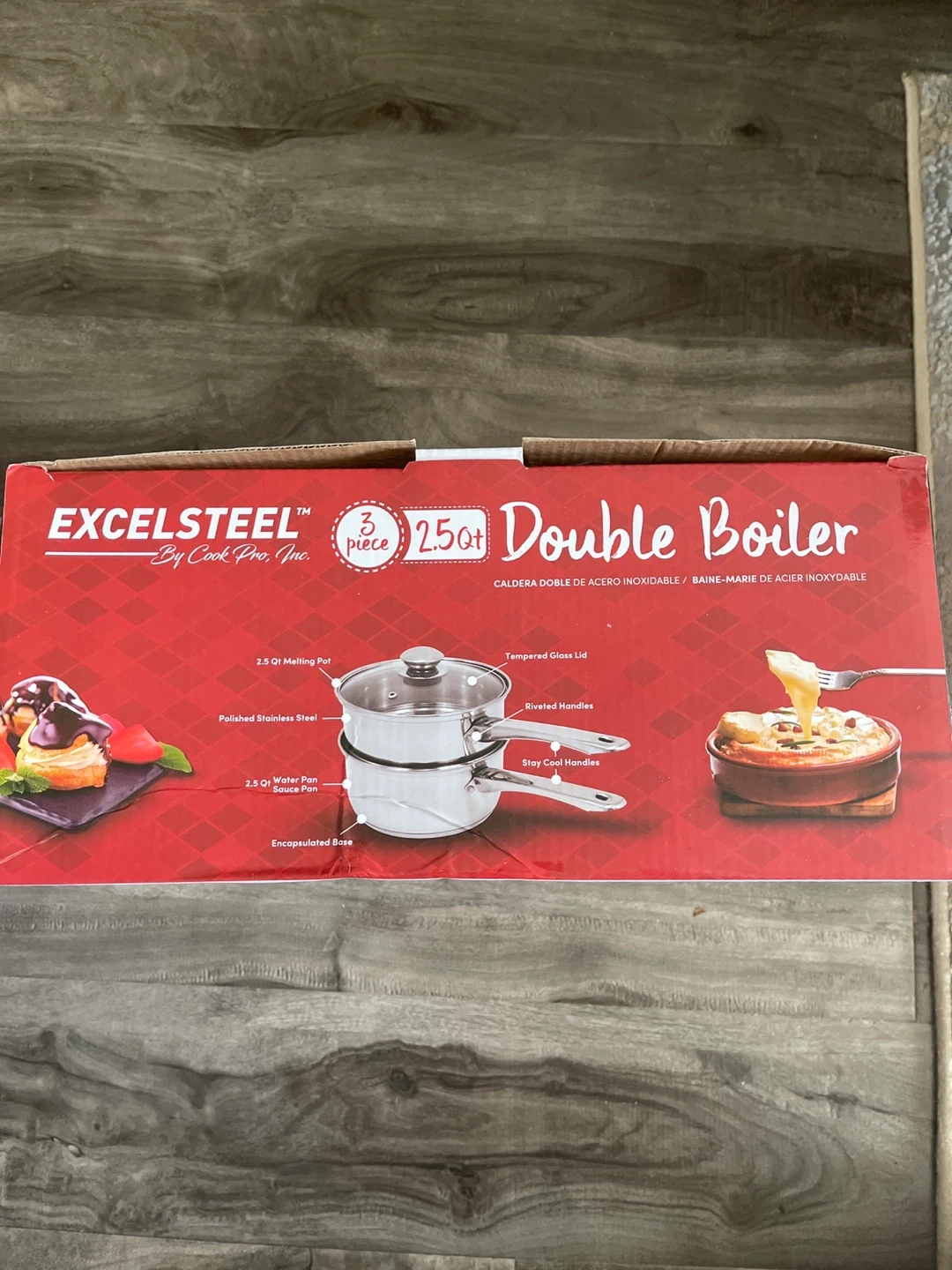 15Selling a brand new ExcelSteel 2.5Qt Double Boiler set! It's a 3-piece set made of highly polished stainless steel. The 2.5 Qt melting pot is ideal for chocolate or cheese. It features stay-cool handles with hanging loops and a see-through tempered glass lid. The pans are dishwasher-safe too!