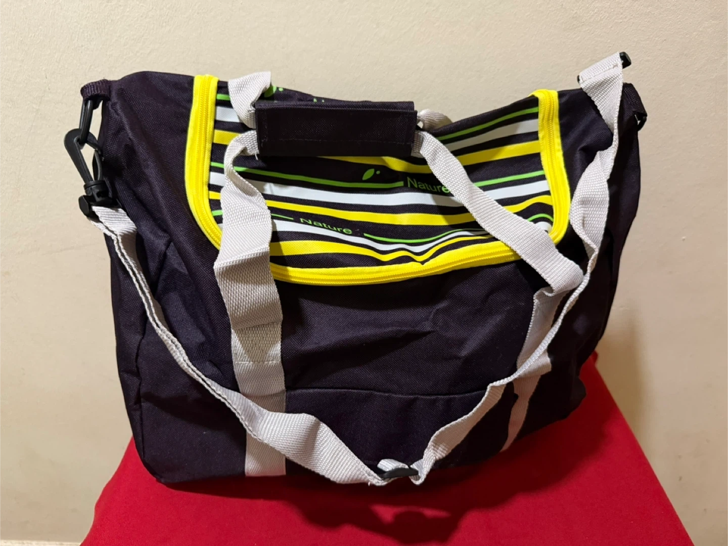 This Nature tote bag is perfect for carrying your essentials! It features a stylish striped design in yellow, white, and green. The bag is in great condition and ready for a new home