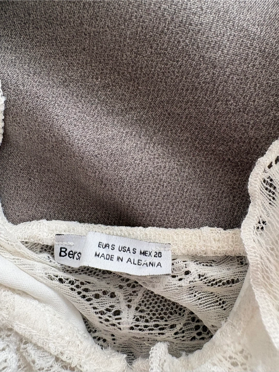 White lace crop top with adjustable straps. Lace overlay with a satin lining. Size S, made in Albania.