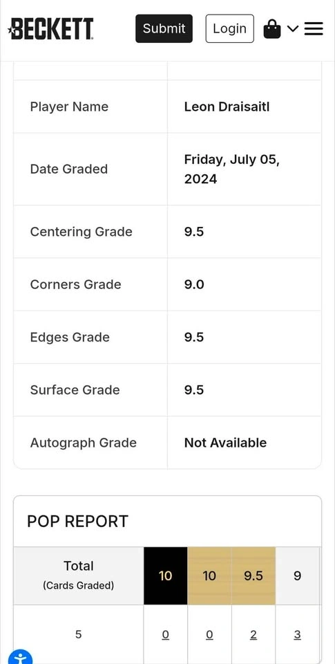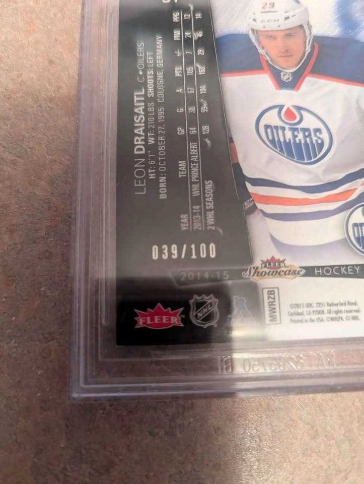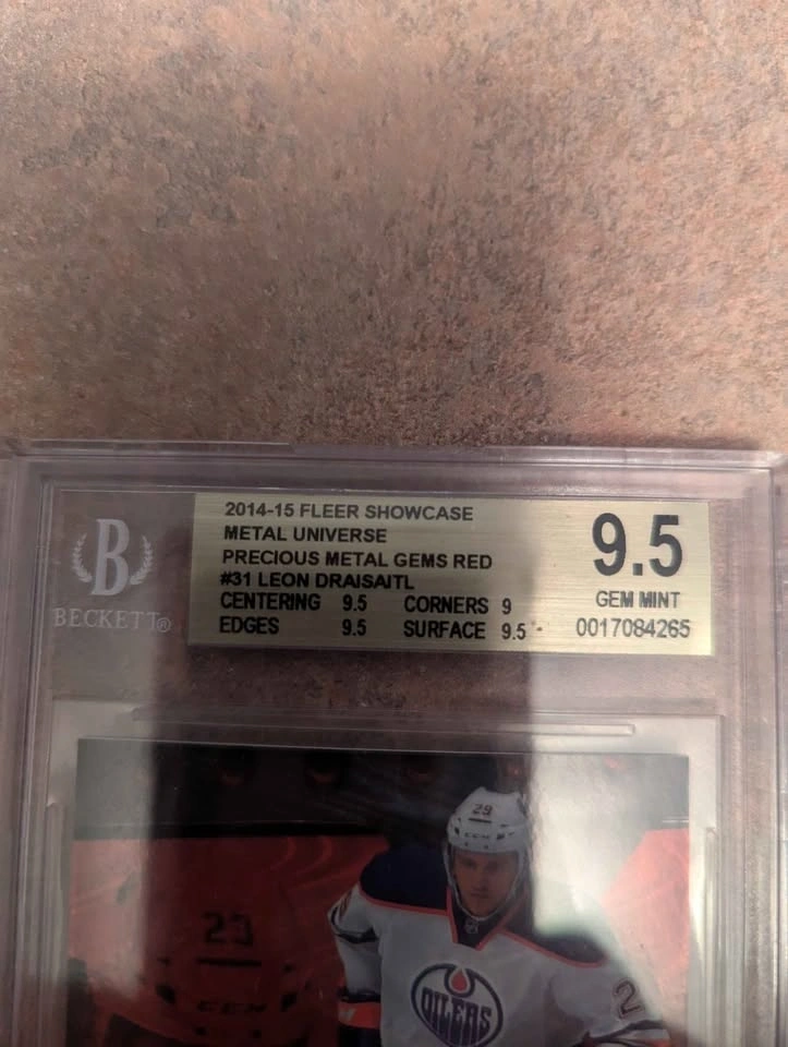 Absolute gem of a rookie card for Leon Draisaitl, graded BGS 9.5. There are only 2 graded at 9.5 on Beckett and zero 10's on PSA. I will listen to offers for sure, no trades. 2014-15 Fleer Showcase Metal Universe Red.