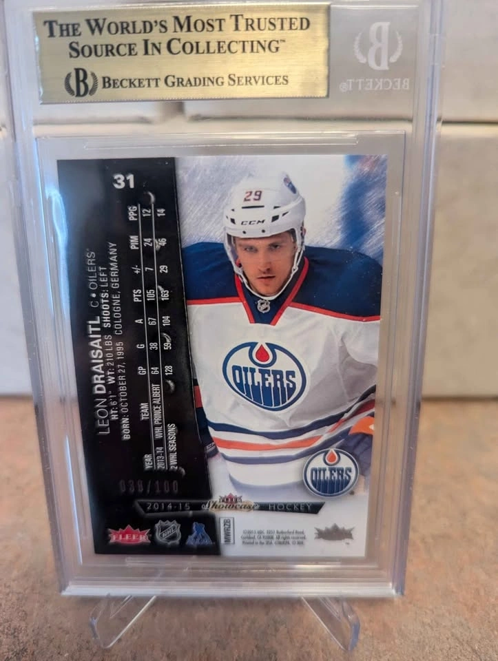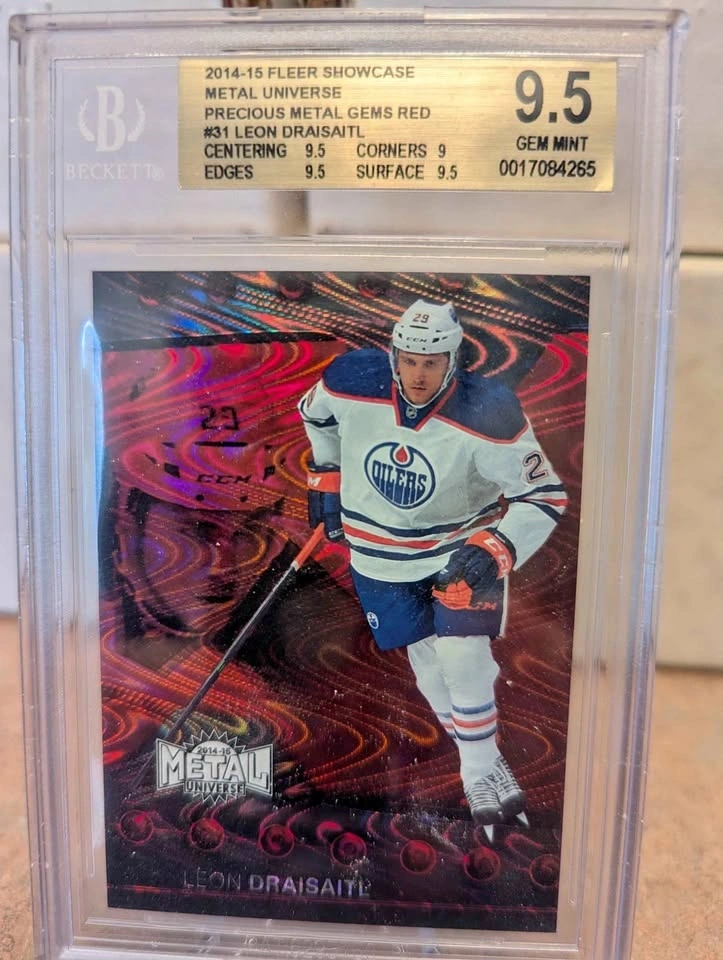 Absolute gem of a rookie card for Leon Draisaitl, graded BGS 9.5. There are only 2 graded at 9.5 on Beckett and zero 10's on PSA. I will listen to offers for sure, no trades. 2014-15 Fleer Showcase Metal Universe Red.