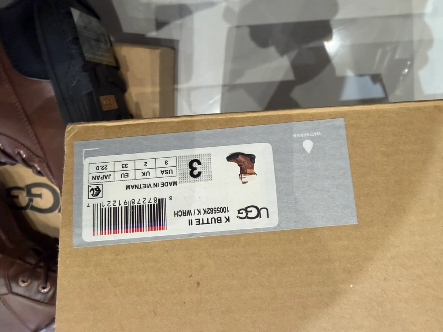 Selling a pair of UGG K Butte II boots in brown, size 3 (kids). These are in great condition and come with the original box. They are waterproof, perfect for keeping little feet dry and cozy!