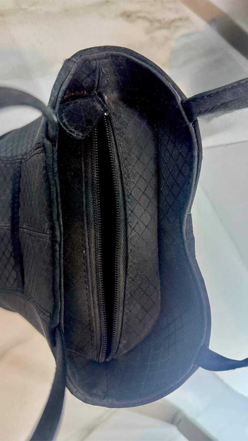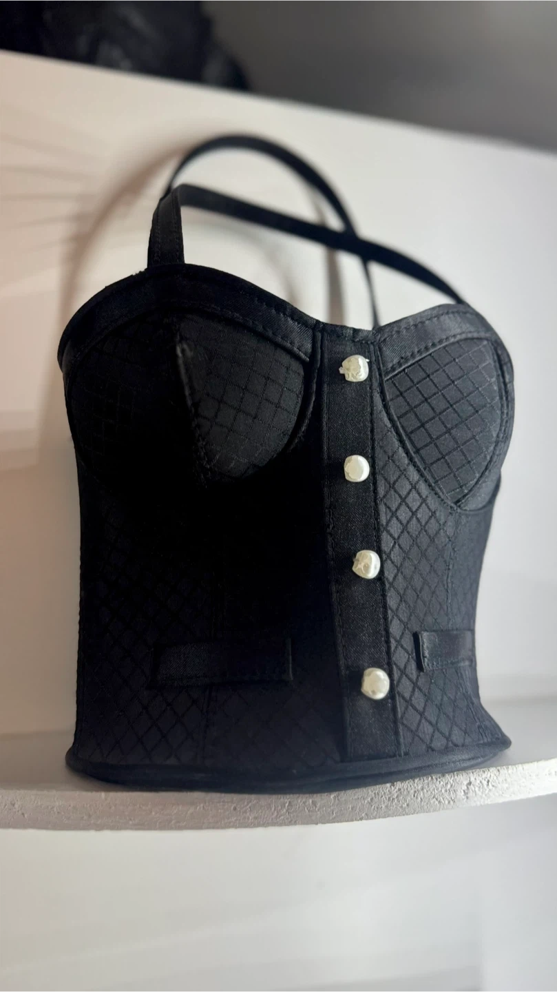 This is a unique black handbag shaped like a corset! It has a quilted pattern and button details on the front. It's in great condition and ready for a new home!