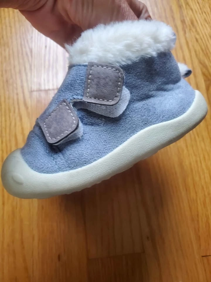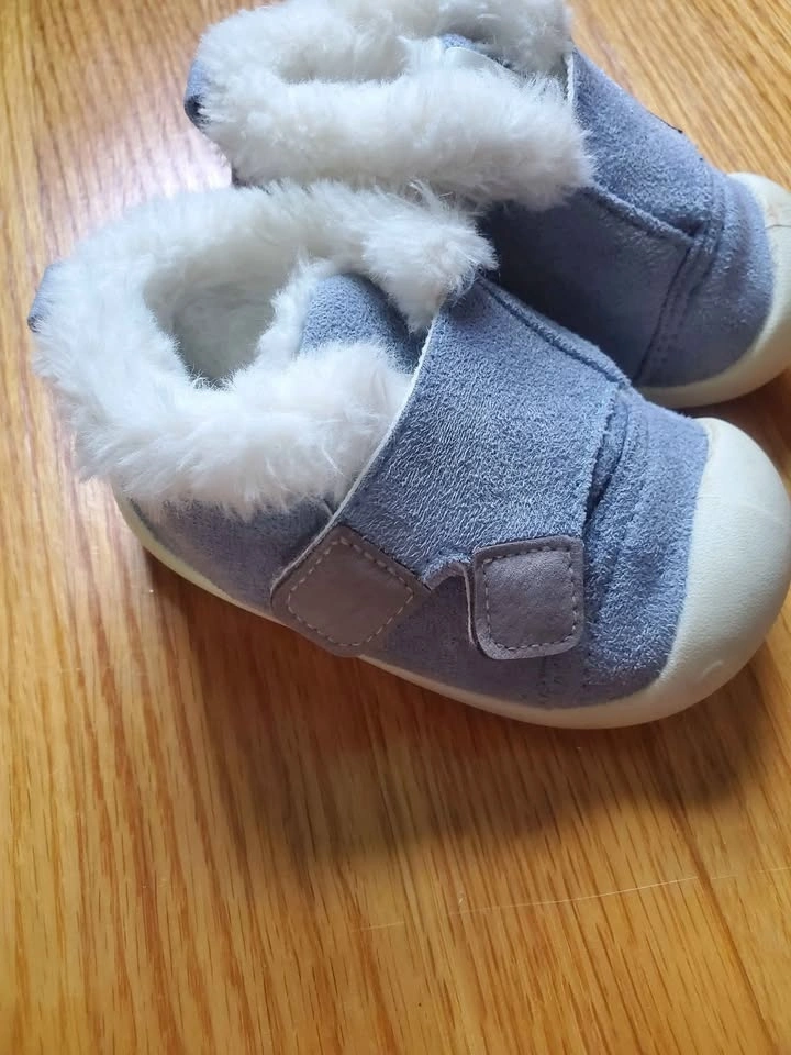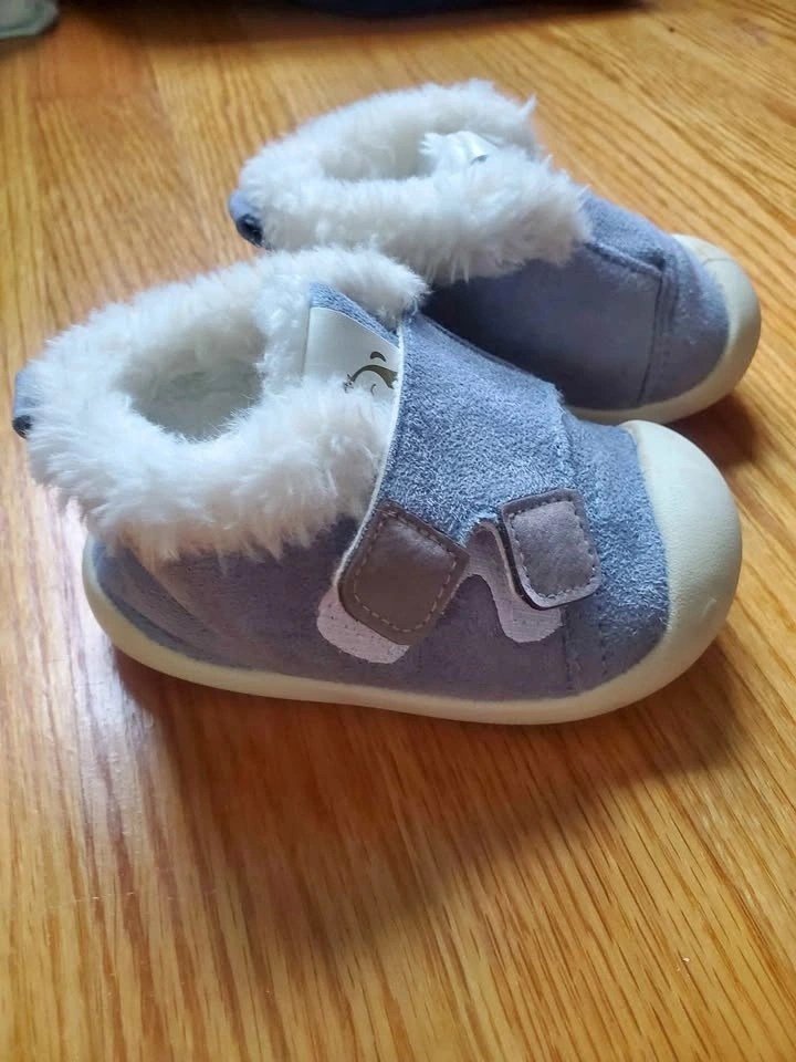 These cozy Vigny Honey baby shoes are perfect for winter. They are gray and white with a faux fur lining and are a size 17, fitting babies approximately 6-12 months old.