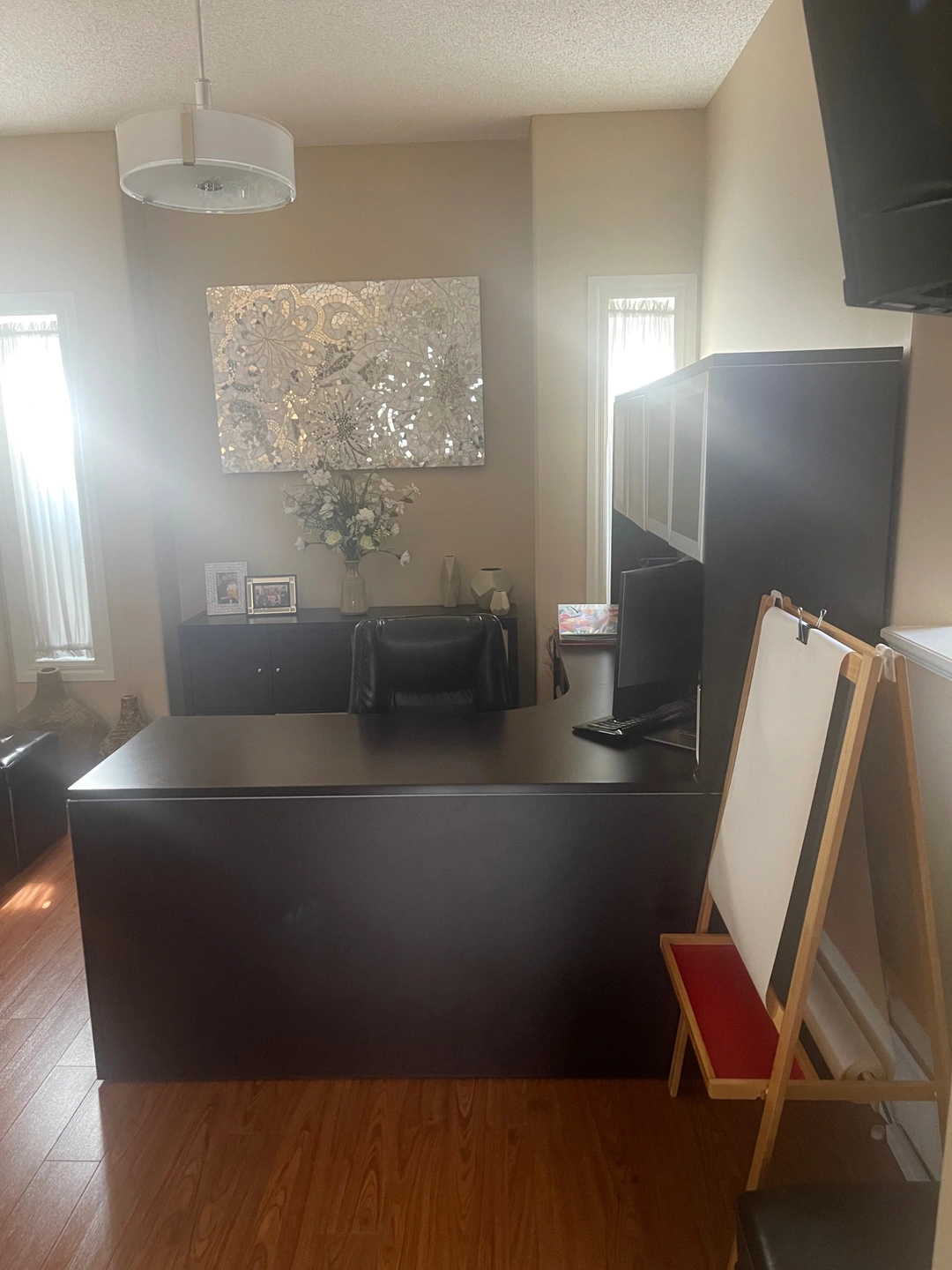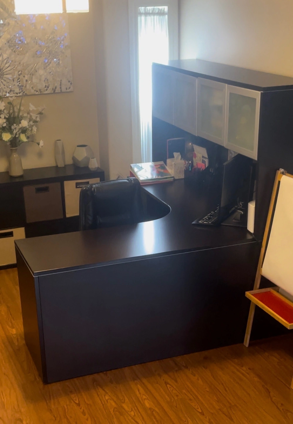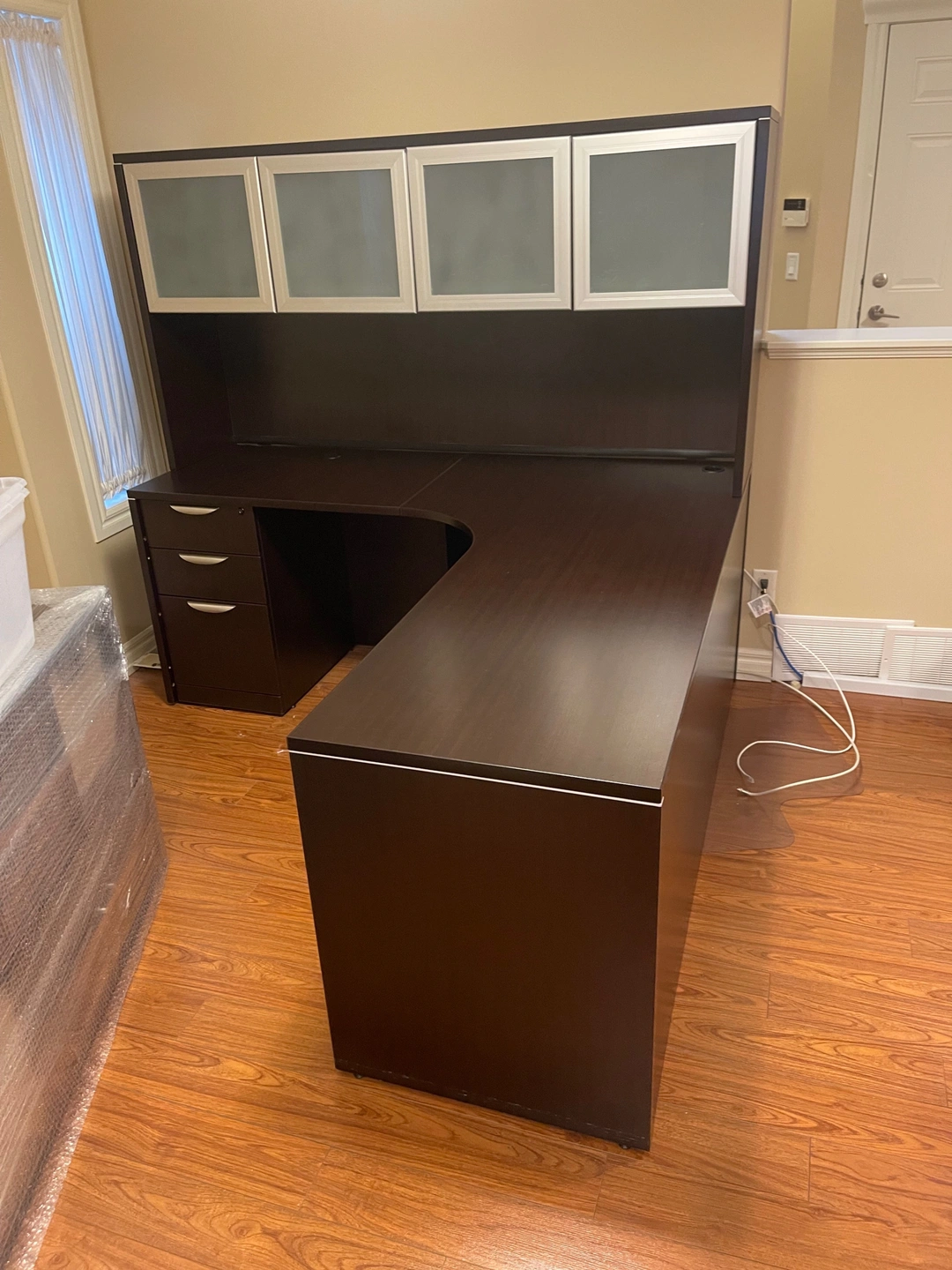 Executive Office Desk with tons of storage space. Brand new ones sell for $1800+. Moving Sale. Well kept and very good condition. Dimensions: 71” x 71” Width x 23.5” Depth 29.5” Height + 36.5” Top Cabinets Height Small Slide in Drawer Storage: 16” Width x 28.5” Height x 22” Depth Cash only. Pick up only, no delivery. OBO but no low ball offers. Cash only. If this ad is up, this item is still available.
