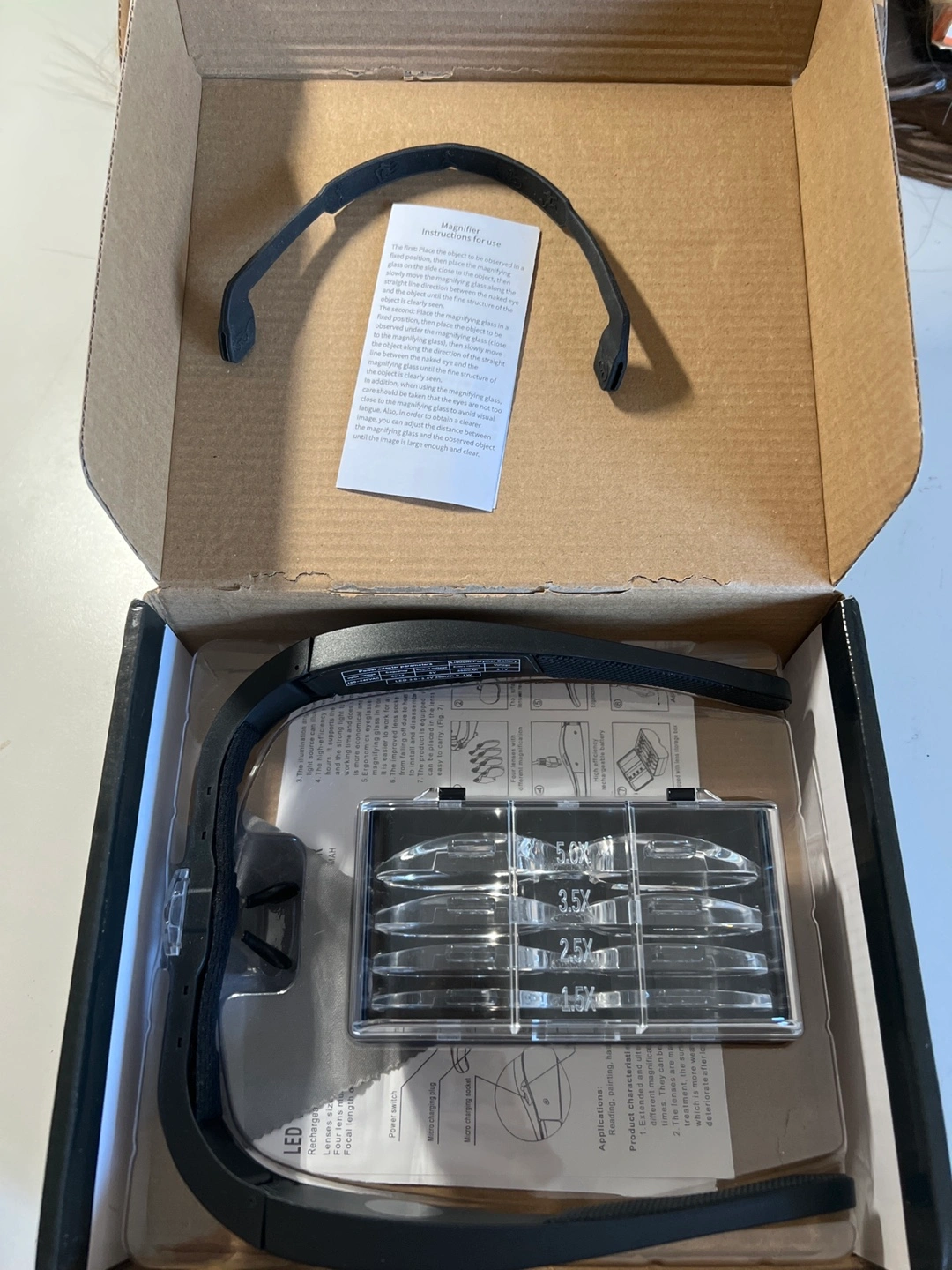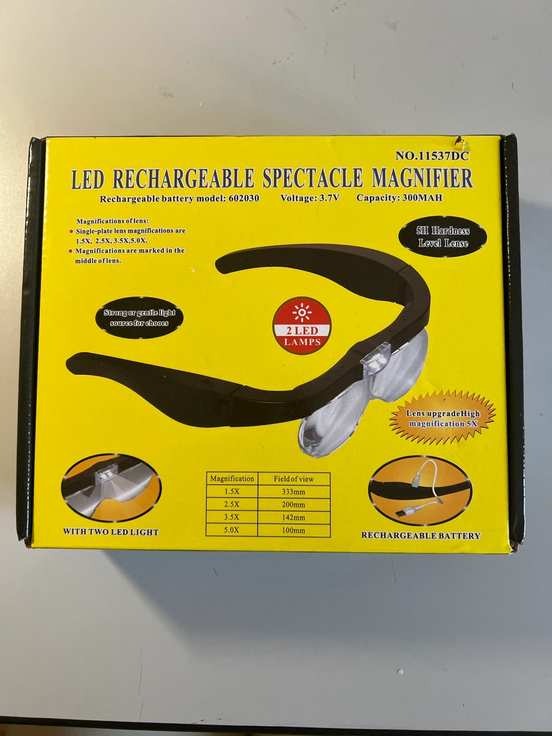 Rechargeable spectacle magnifier. Features 2 LED lamps. Includes multiple magnification lenses: 1.5X, 2.5X, 3.5X, 5.0X. Great for reading and detailed work. Comes in original packaging.