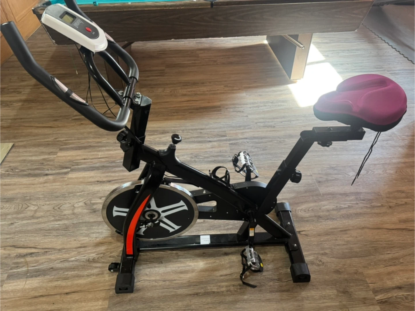 Selling a used exercise bike. It's in good condition and comes with a comfortable pink seat cover. Great for getting a workout in at home!