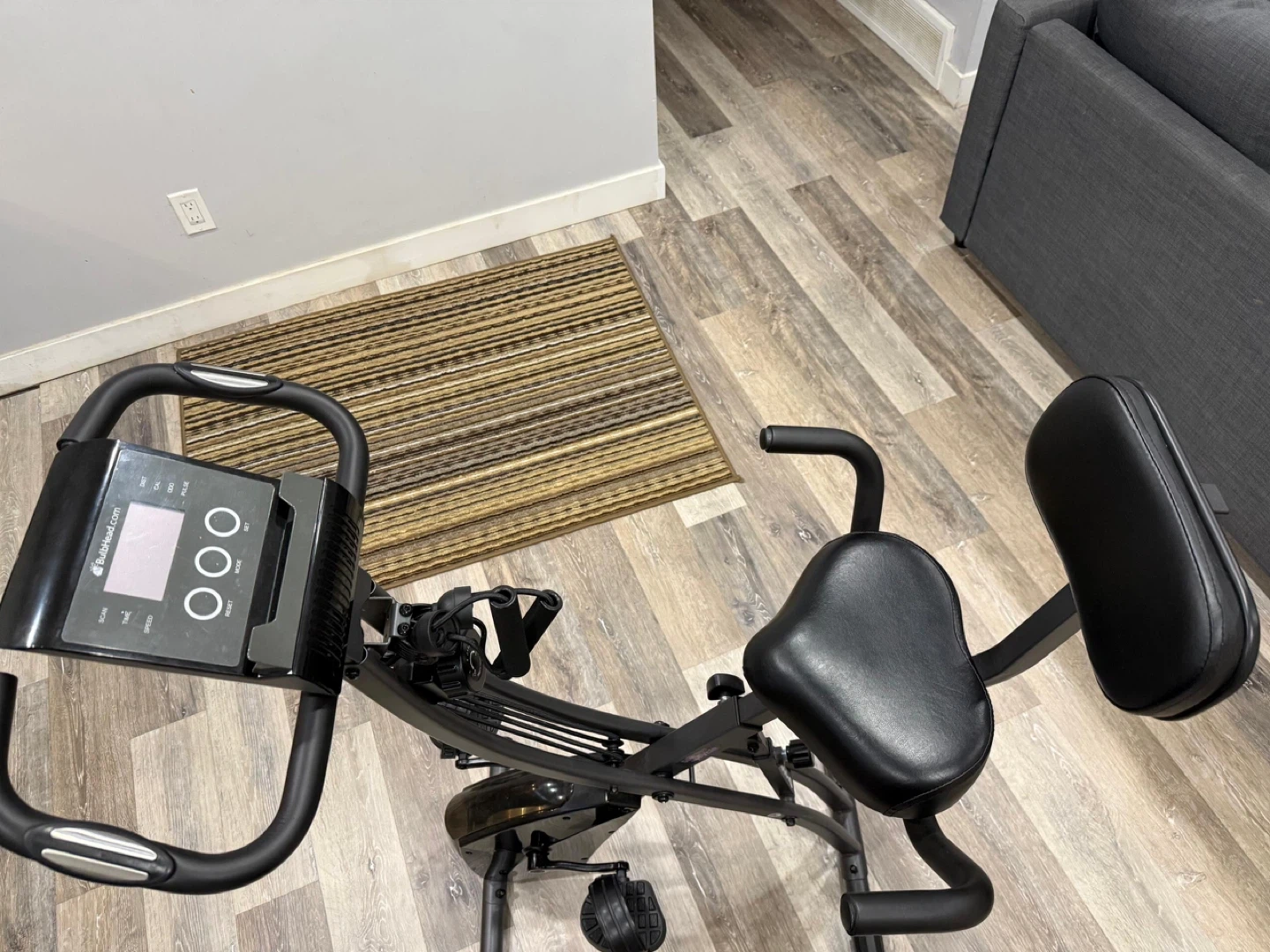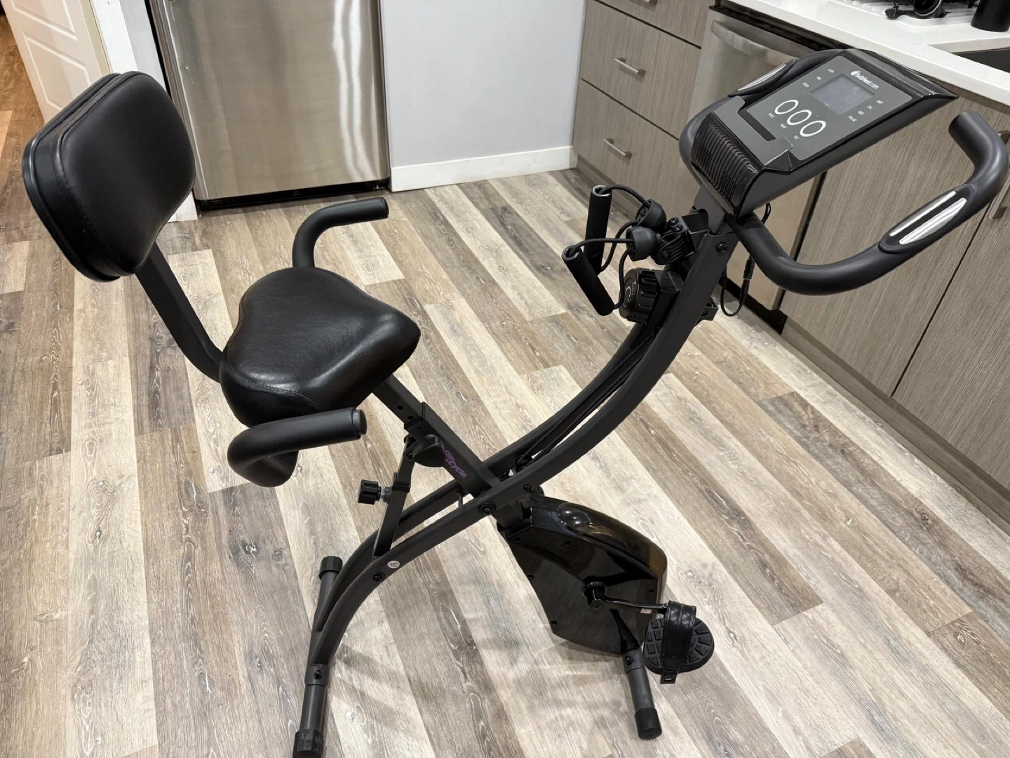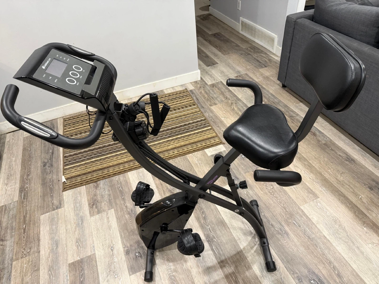 73Get fit with this Exerpeutic folding magnetic upright exercise bike! It's in great shape and ready for a new home. Folds easily for storage, so it's perfect if you're tight on space. Features a large seat cushion and back rest for comfortable workouts.