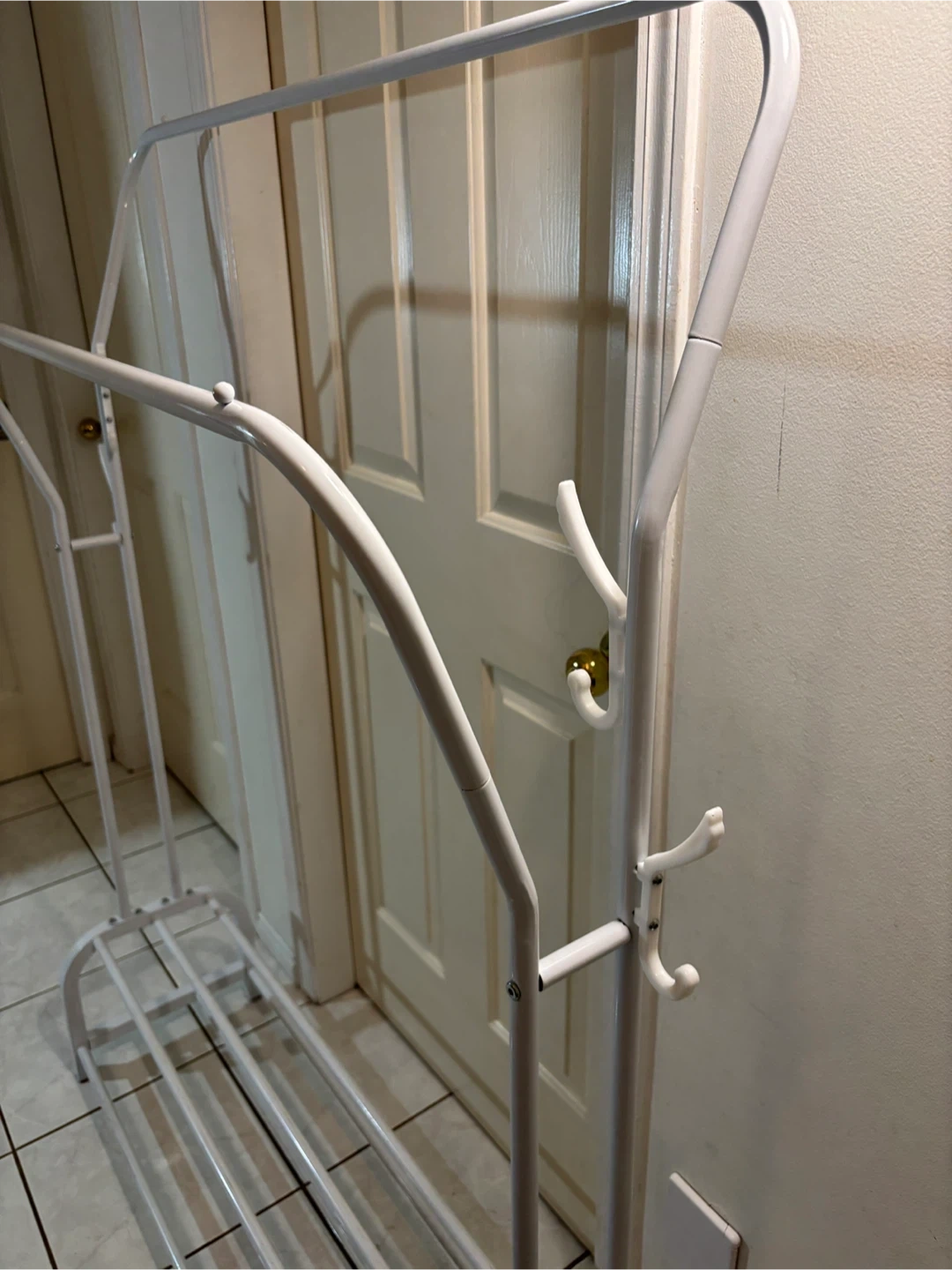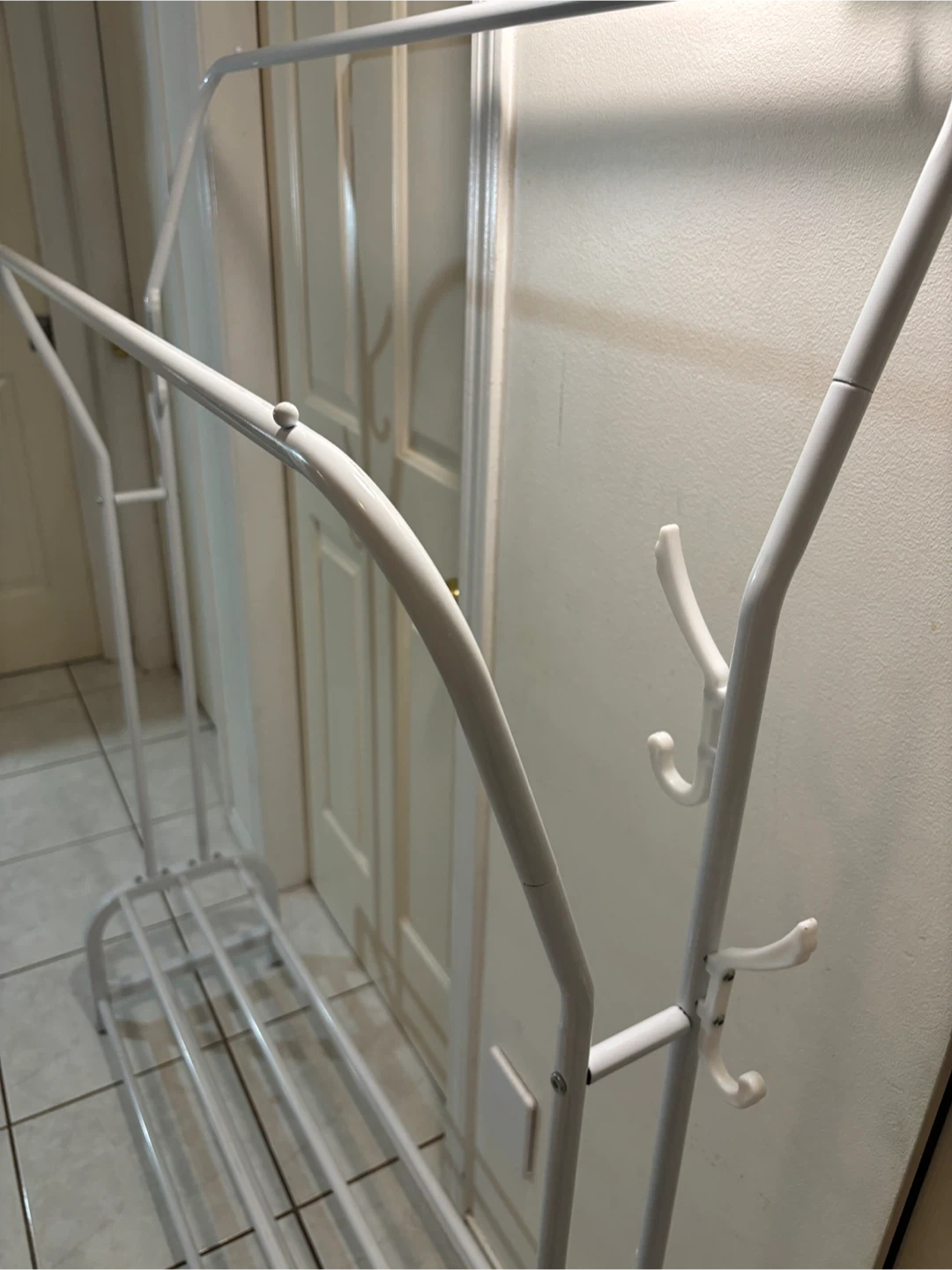Lightweight double-rod clothes rack offering practical hanging and storage space. Features two hanging rods at different heights, plus extra hooks on the end and inside for bags, hats, or accessories. Includes a bottom shoe rack - great for bedrooms, entryway or closets.