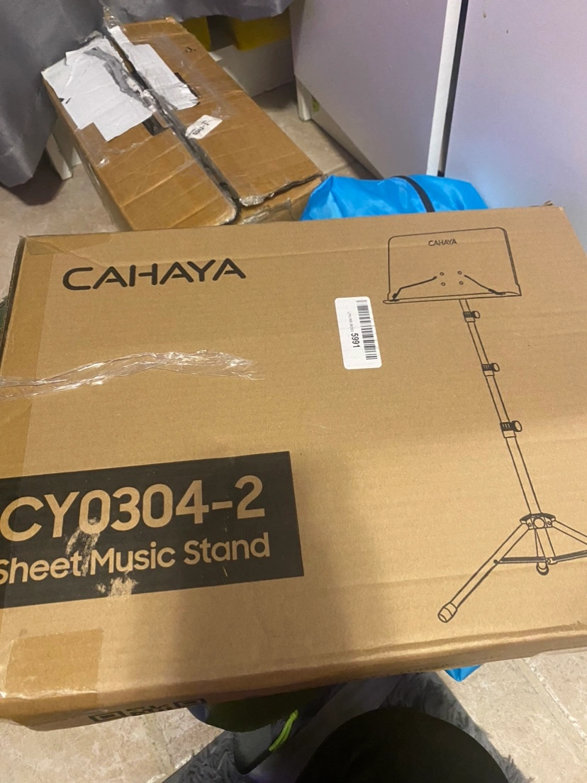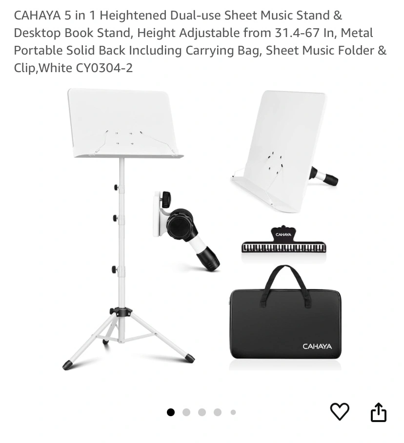 This is a 5 in 1 sheet music stand that includes a carrying bag, sheet music folder, and clip. It is height adjustable and can be used as a desktop book stand.