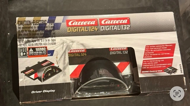 This Carrera Digital 124/132 Driver Display is compatible with Carrera Digital 124 and 132 systems. It is in its original packaging, which has some wear and tear. The item itself is unused and is in new condition. Displays vital racing information.