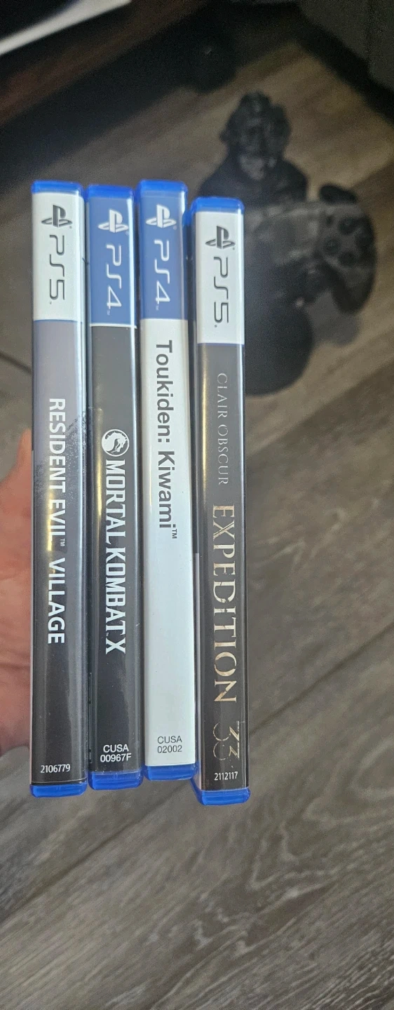 Four video games for Playstation consoles. Includes Resident Evil Village for PS5, Mortal Kombat X for PS4, Toukiden: Kiwami for PS4, and Clair Obscur: Expedition 33 for PS5. These are physical copies.