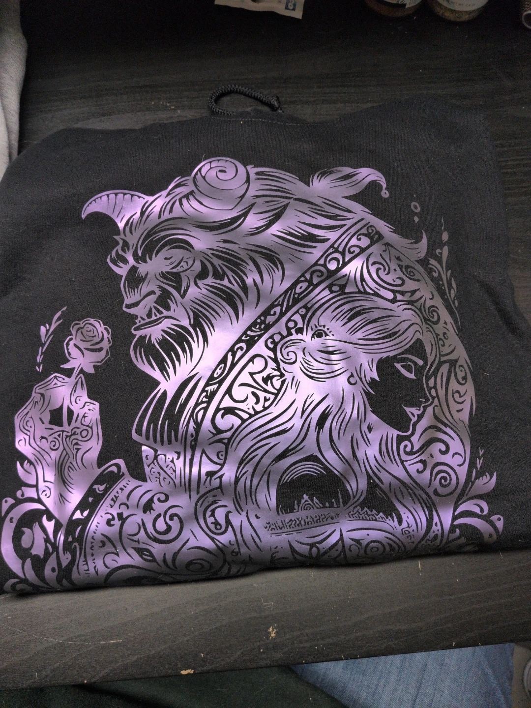 Selling a black hoodie with a Beauty and the Beast design in a light purple colour. Brand new condition and perfect for any Disney fan!