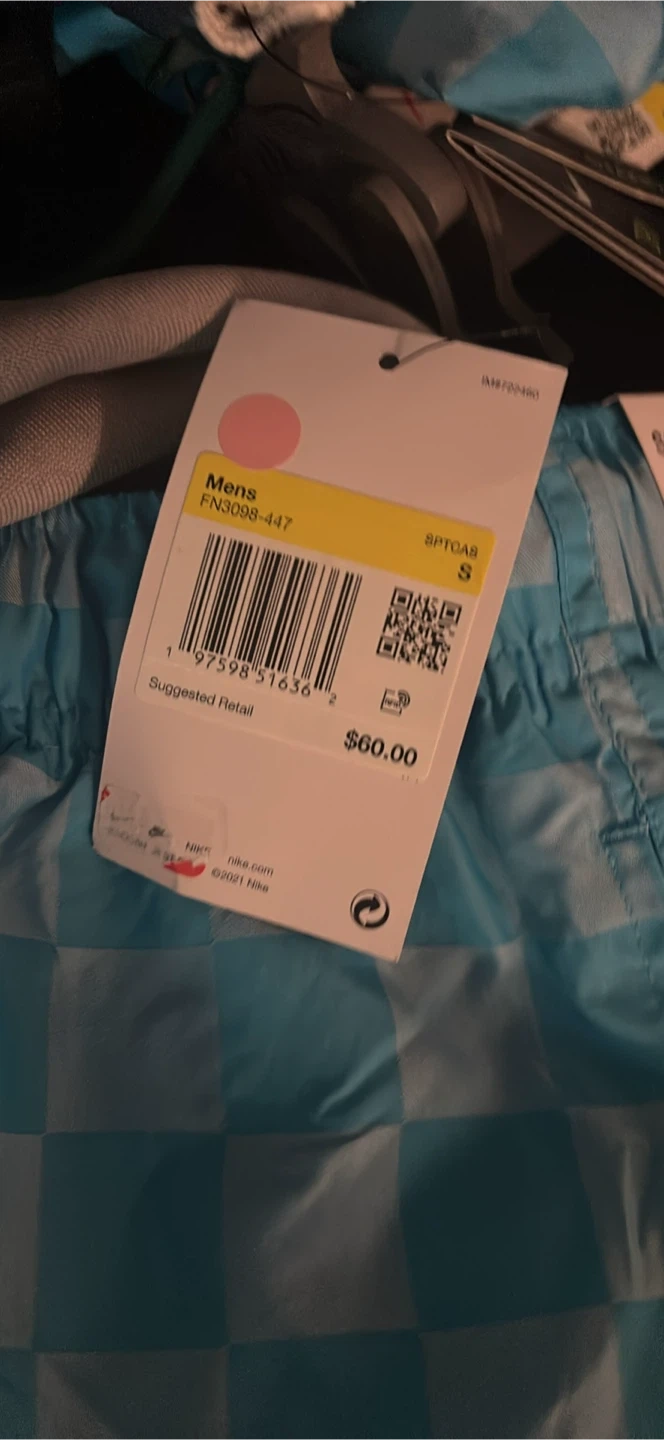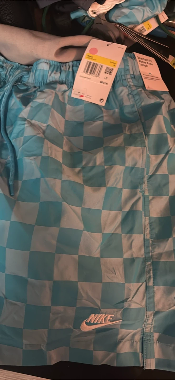 Nike men's shorts in a light blue checkerboard pattern. Made with lightweight material for comfort. Size S. Originally suggested retail $60.00.