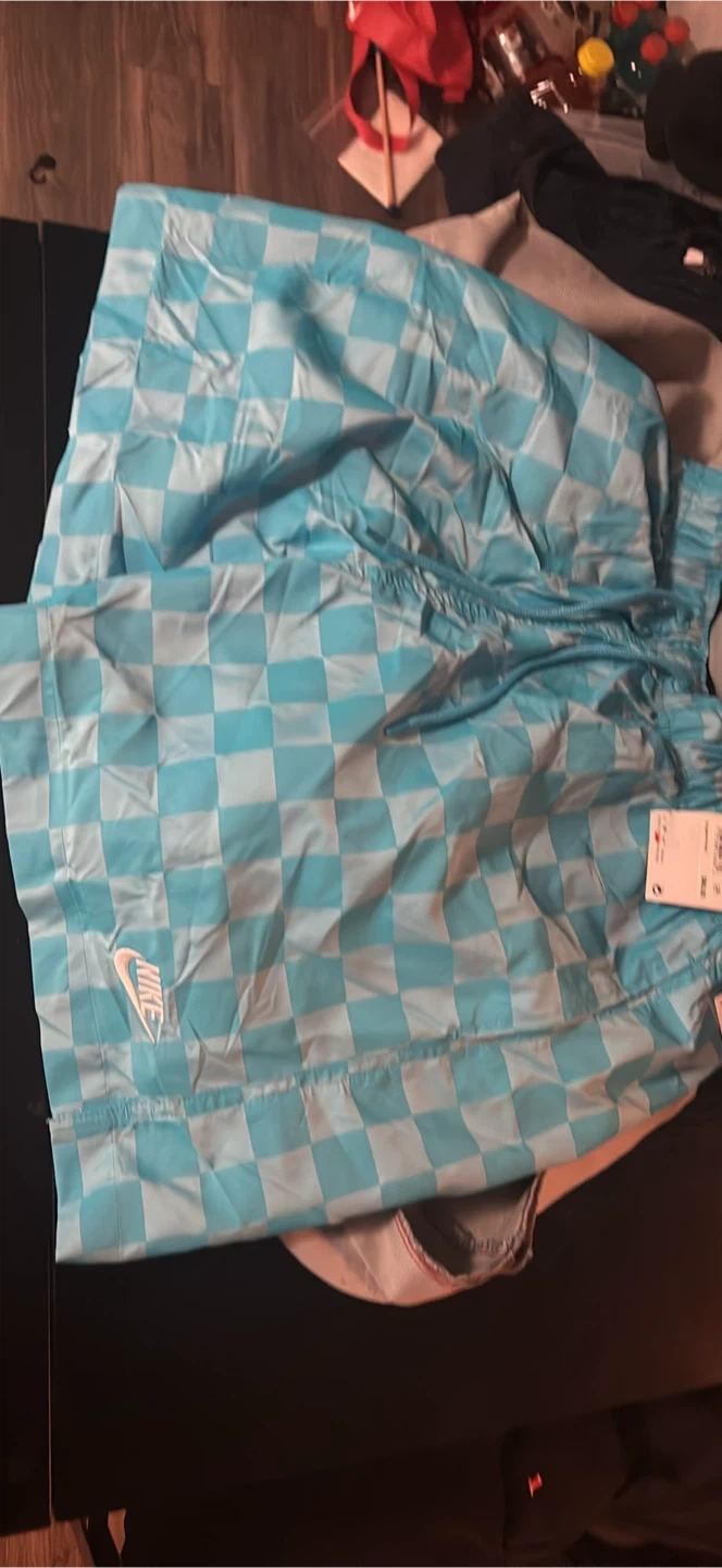 Nike men's shorts in a light blue checkerboard pattern. Made with lightweight material for comfort. Size S. Originally suggested retail $60.00.