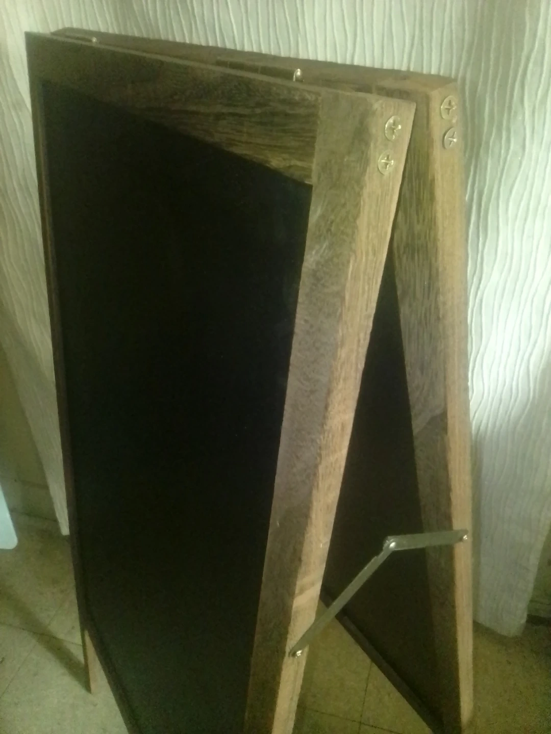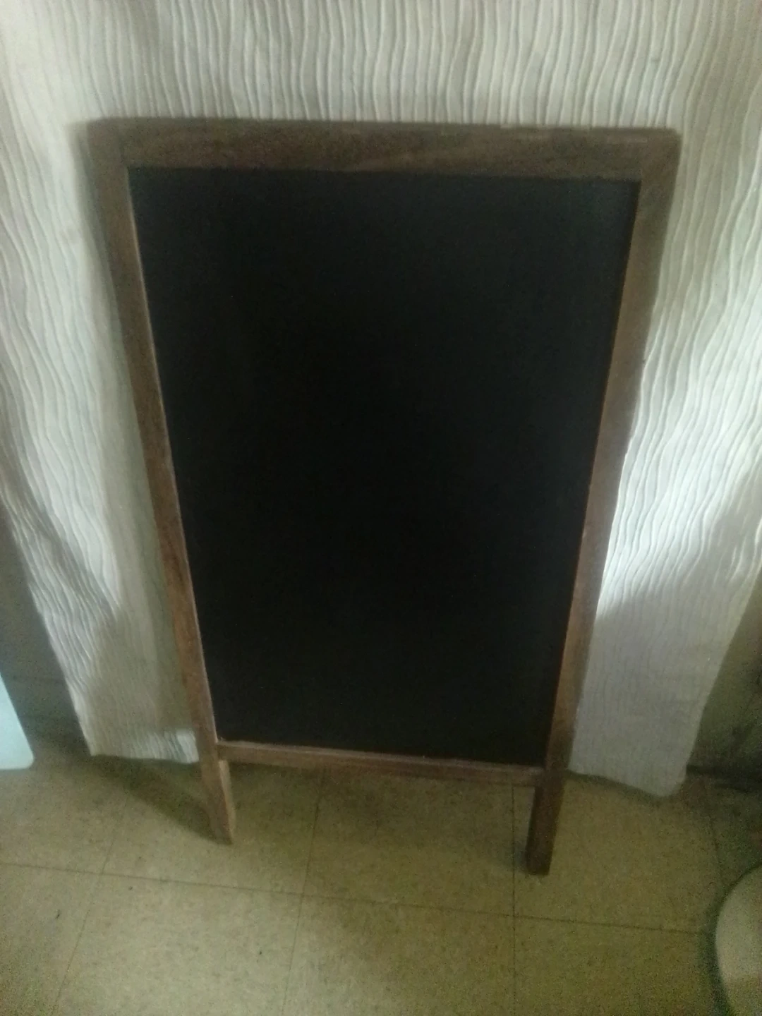 Wooden A-frame chalkboard sign. It's double-sided for extra writing space. This easel-style board is perfect for menus or messages!