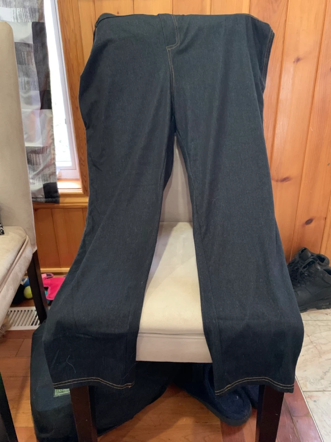 Dark wash denim look leggings They feature contrast stitching along the seams. These pants are made for comfort.