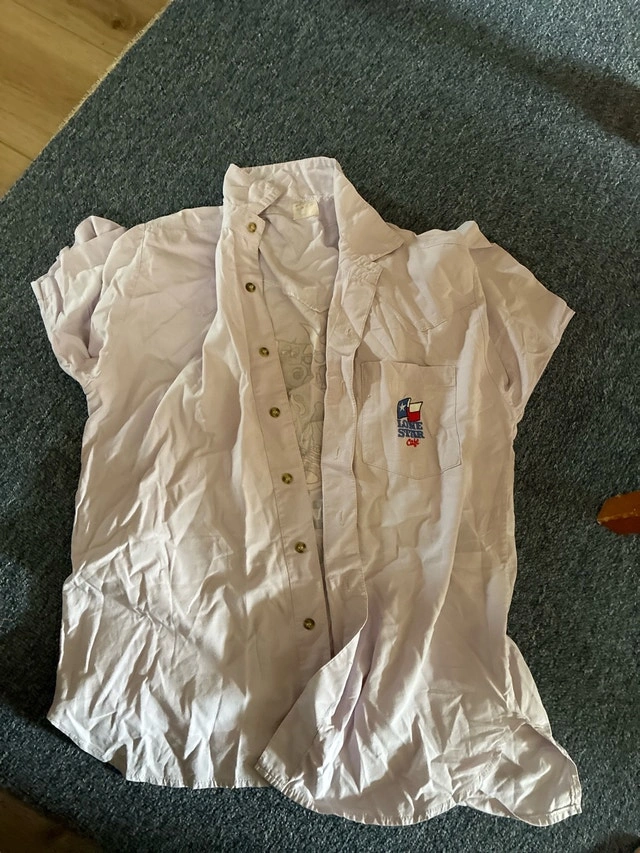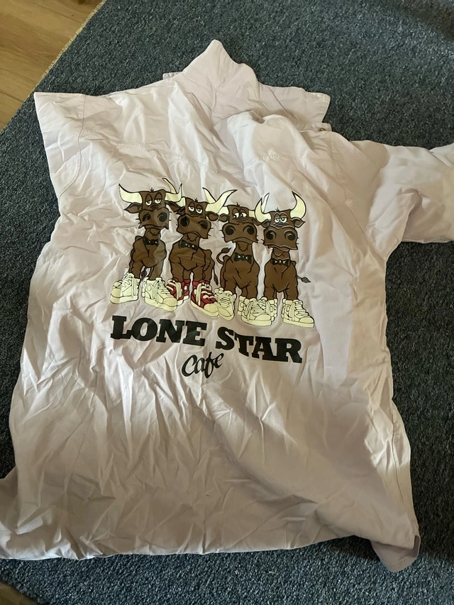 Get a piece of history with this pre-owned Lone Star Cafe button-down shirt, showcasing a unique design featuring cartoon cows and the iconic Lone Star Cafe logo. It's a conversation starter and a fun addition to any wardrobe. Specifics: - Brand: Lone Star Cafe - Design: Cartoon cows with Lone Star Cafe logo - Type: Button-down Size large If the ad is up, it's still available!
