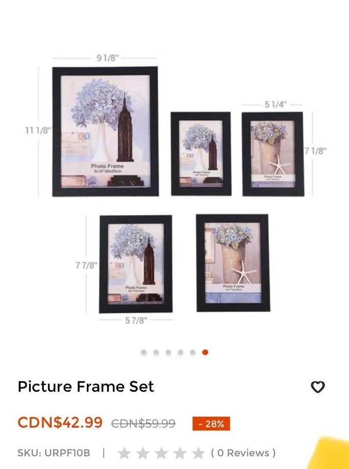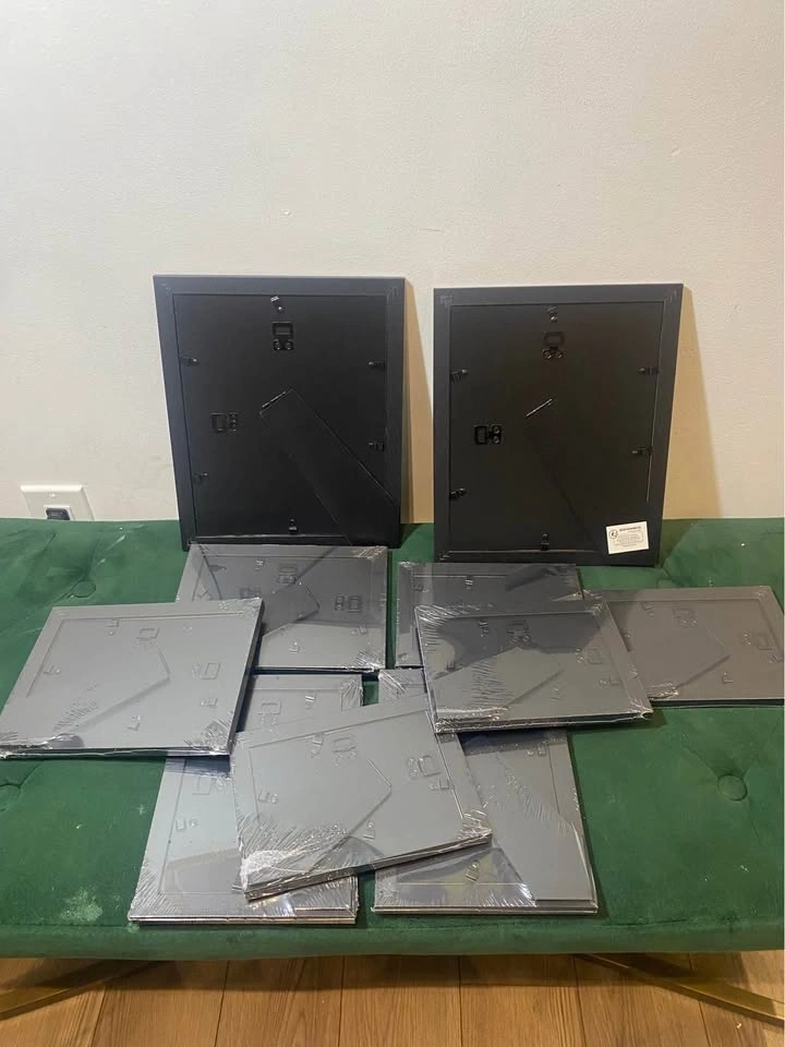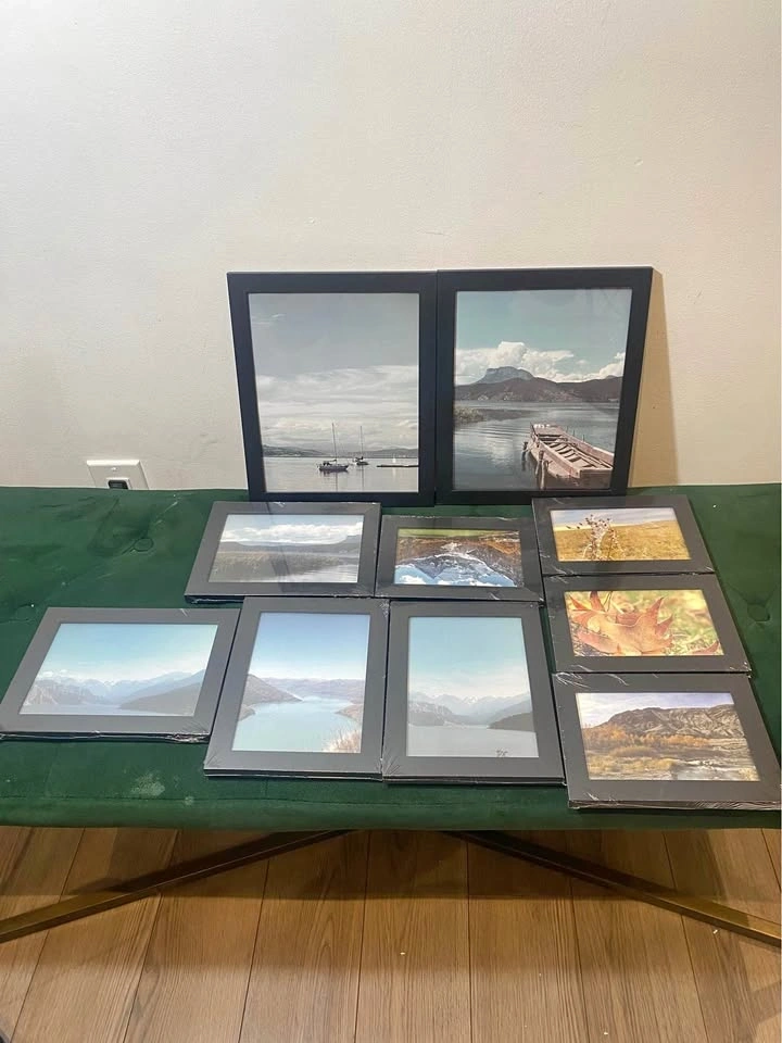 Brand new set of black picture frames in various sizes. Frames are still wrapped in plastic. Sizes range from 5 1/4 x 7 1/8 to 9 1/8 x 11 1/8 inches. Pick up: Brock Road and Rex Heath Drive in Pickering.
