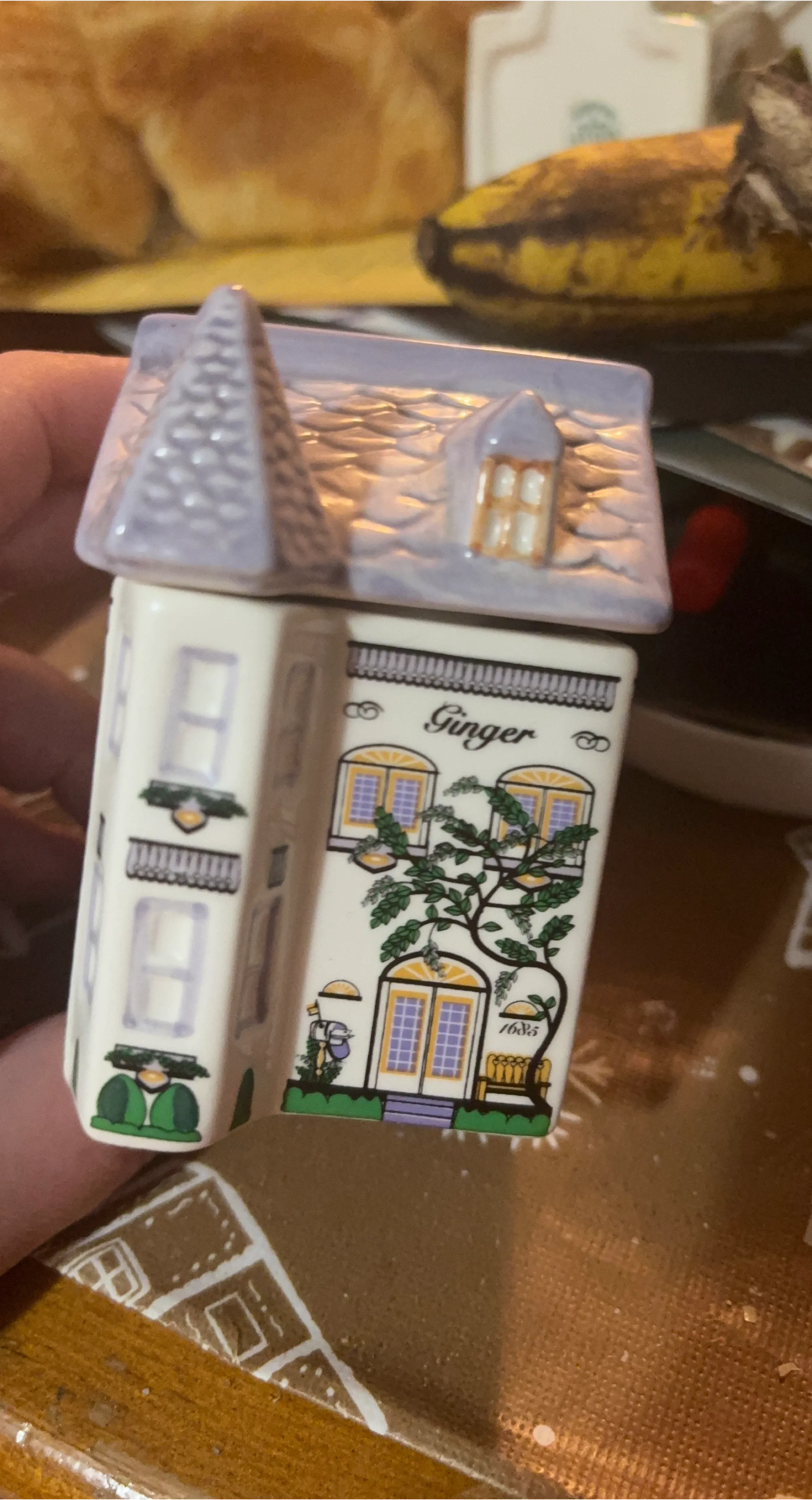 A charming ceramic house-shaped container labelled "Ginger". It features a decorative design with windows, doors, and a bench. Perfect for storing small kitchen items or as a decorative piece! It’s a spice jar . Avon brand