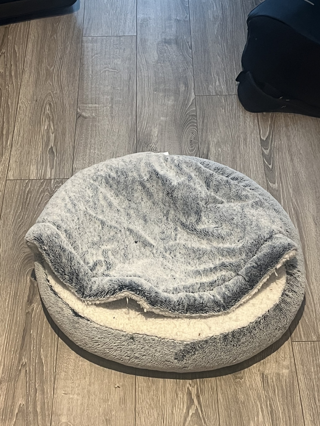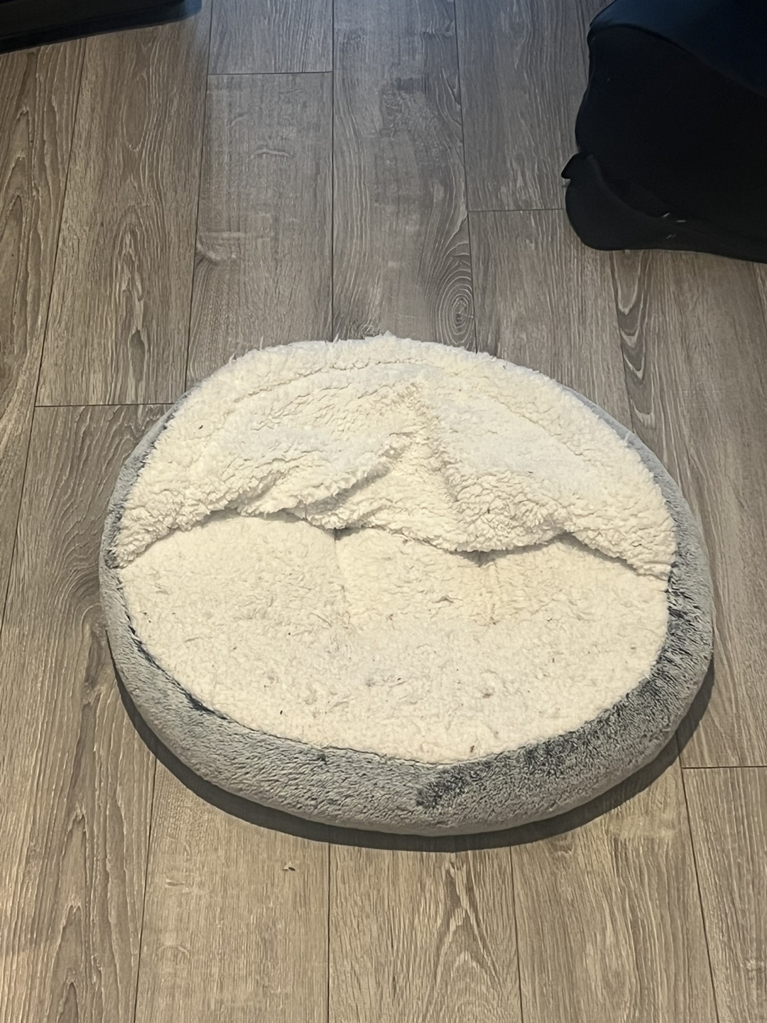 Round pet bed. Soft, fluffy material. Grey and white colour scheme. Perfect for small to medium-sized pets. Provides a warm and comfortable sleeping space.