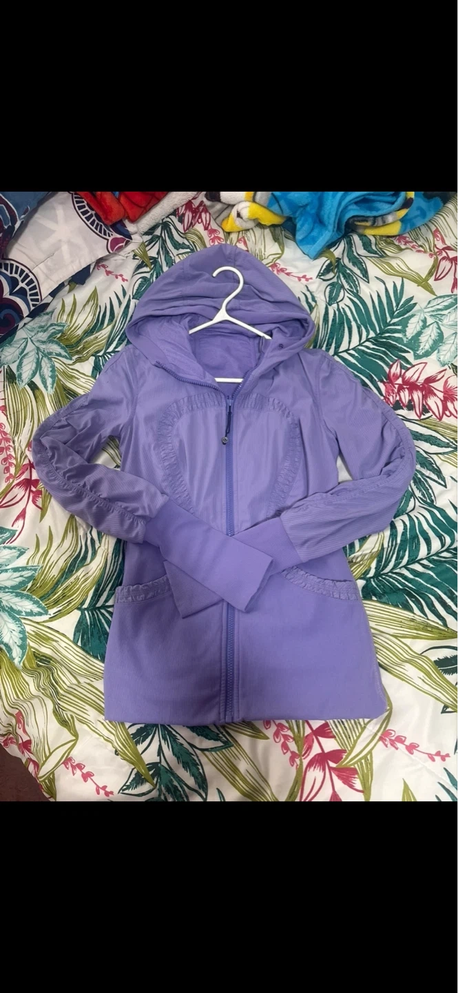A Lululemon hooded zip-up jacket in a lovely lavender colour. It has thumbholes on the sleeves for added comfort. Great for workouts or casual wear! Size 4 pick up cash only