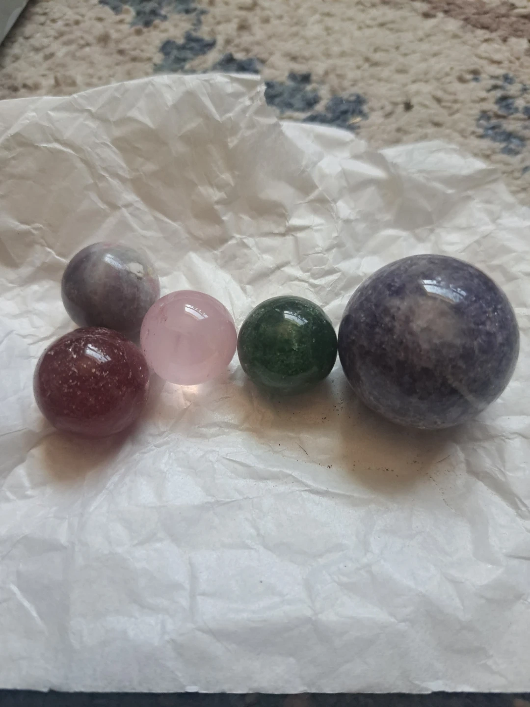 A collection of five polished crystal balls in various colours. Includes a larger purple speckled ball, a pink rose quartz, a green aventurine, and two smaller red and purple orbs. Smooth and rounded.