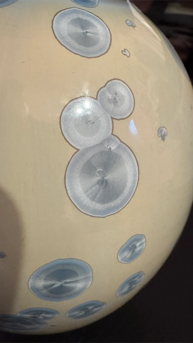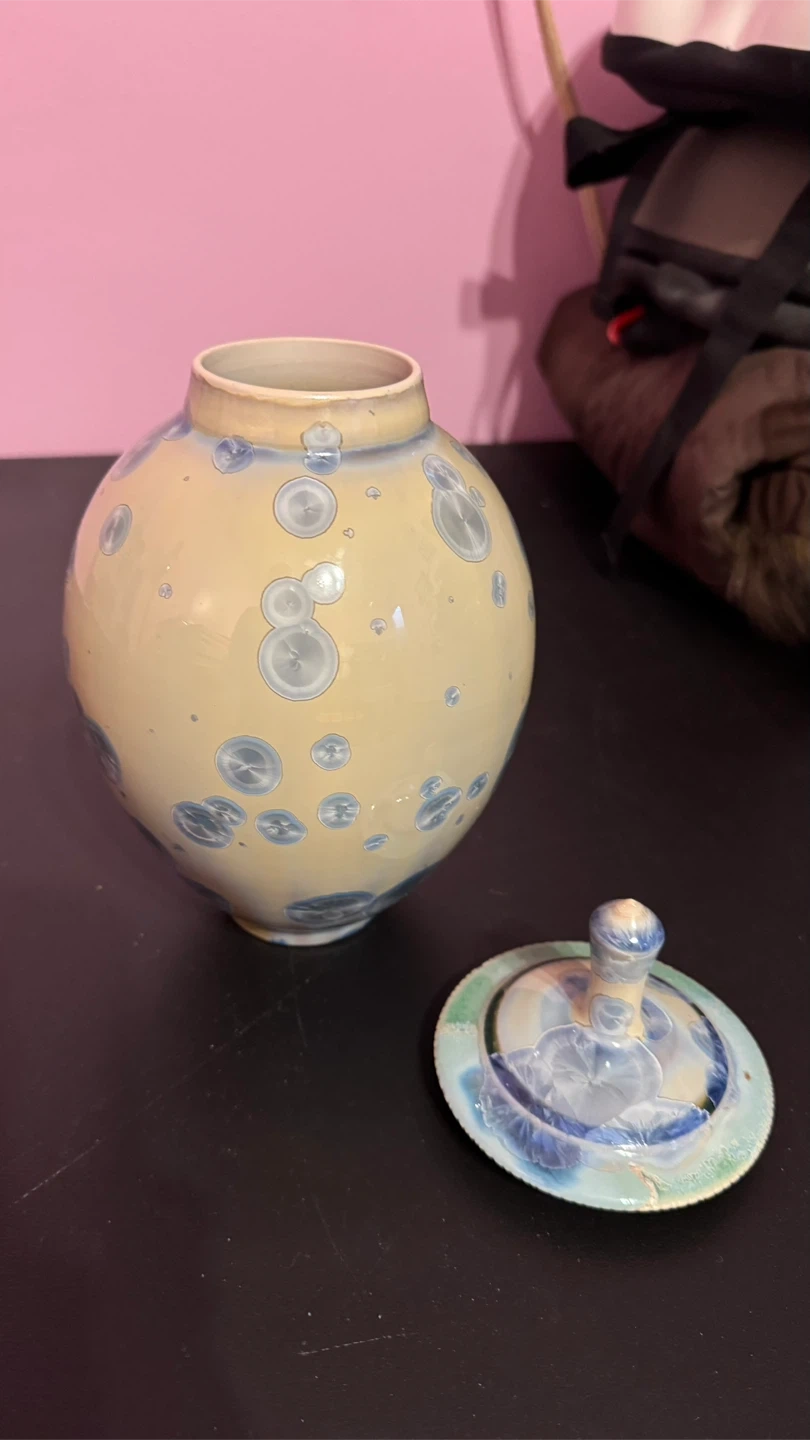 Beautiful handmade ceramic jar with a matching lid. Features a unique crystalline glaze pattern in shades of blue and white on a pale yellow background. Perfect for decorative storage or as a statement piece in your home! Approx. 17cm tall.
