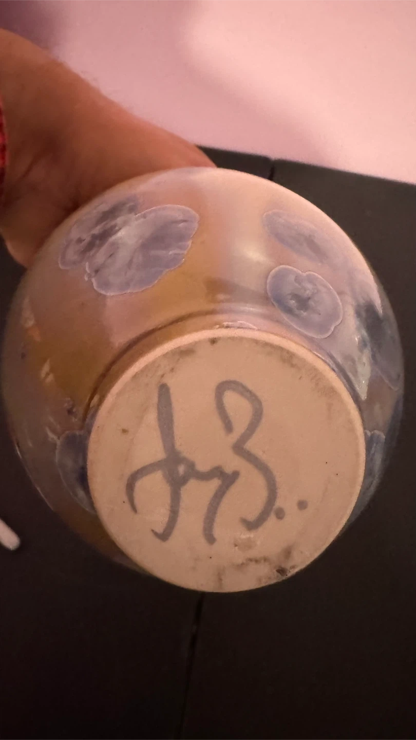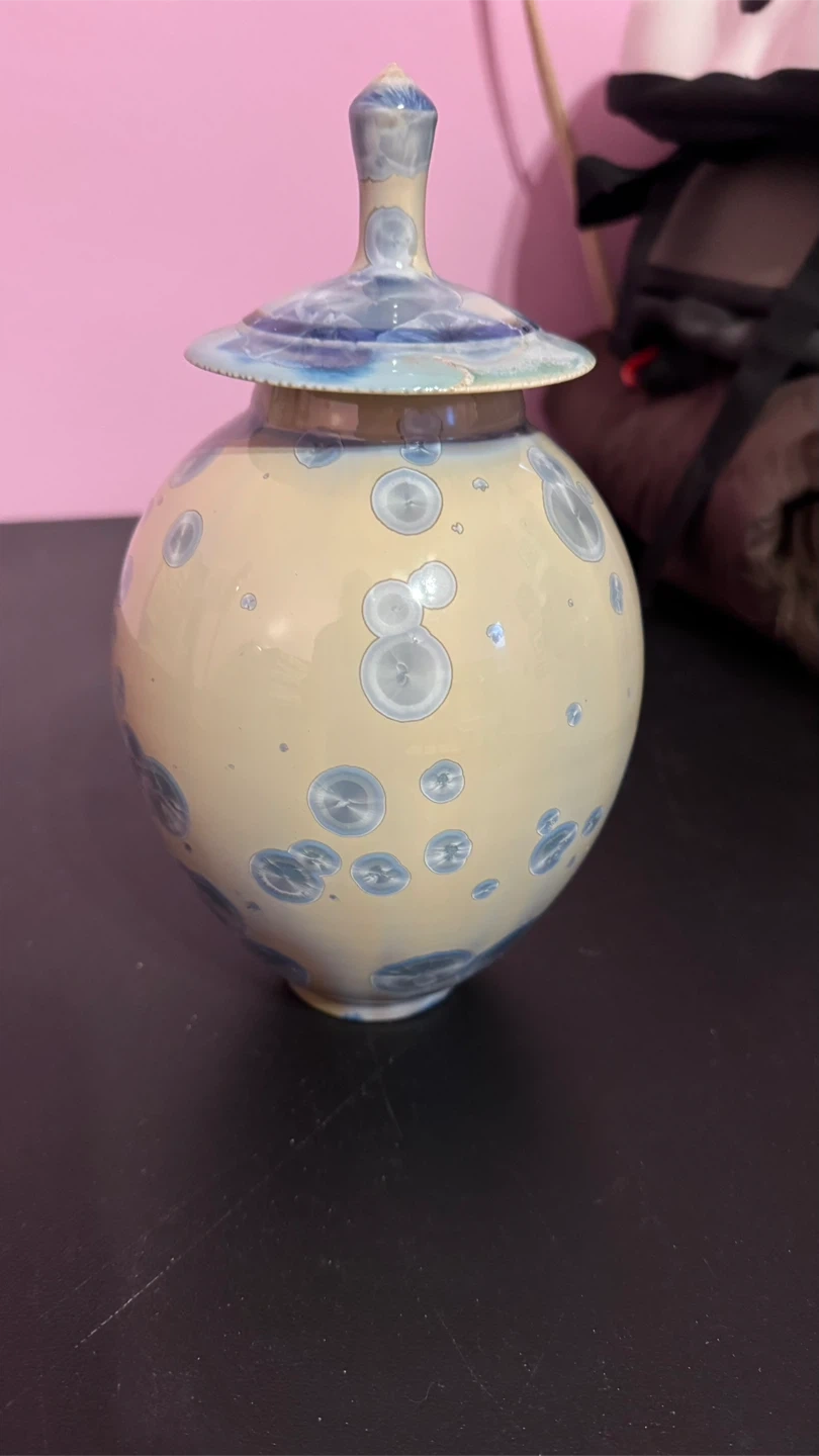 Beautiful handmade ceramic jar with a matching lid. Features a unique crystalline glaze pattern in shades of blue and white on a pale yellow background. Perfect for decorative storage or as a statement piece in your home! Approx. 17cm tall.