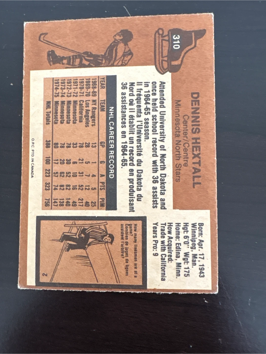 Dennis Hextall hockey card for the Minnesota North Stars. The card details his NHL career stats. Born in 1943.