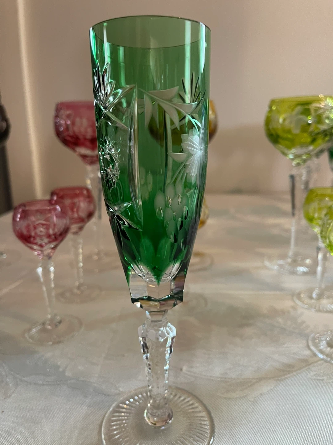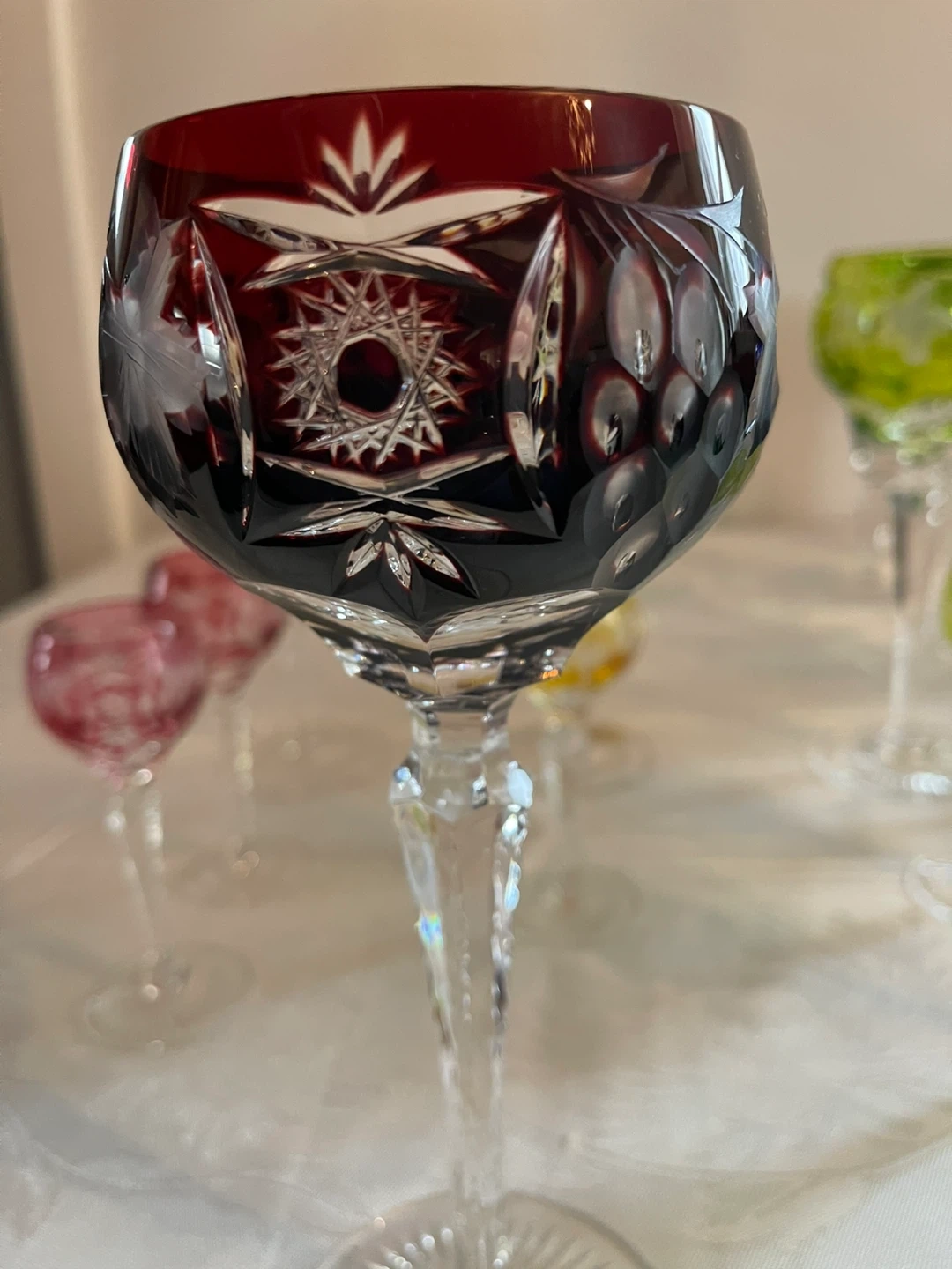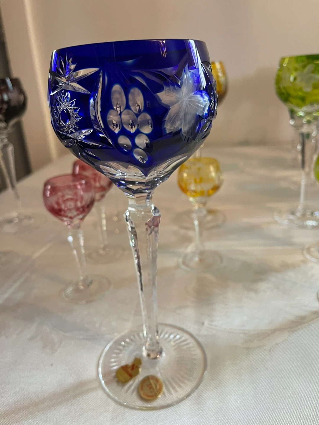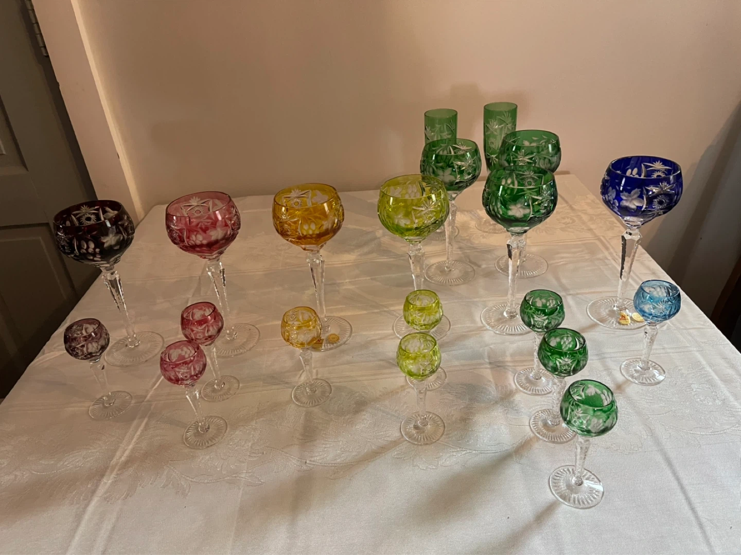 Nachtmann Traube lead crystal glasses in all the colours of the rainbow. Includes 8 wine glasses, 10 cordial glasses, and 2 champagne glasses. All have had minimal use, no chips or scratches to be found. Colours as shown.
