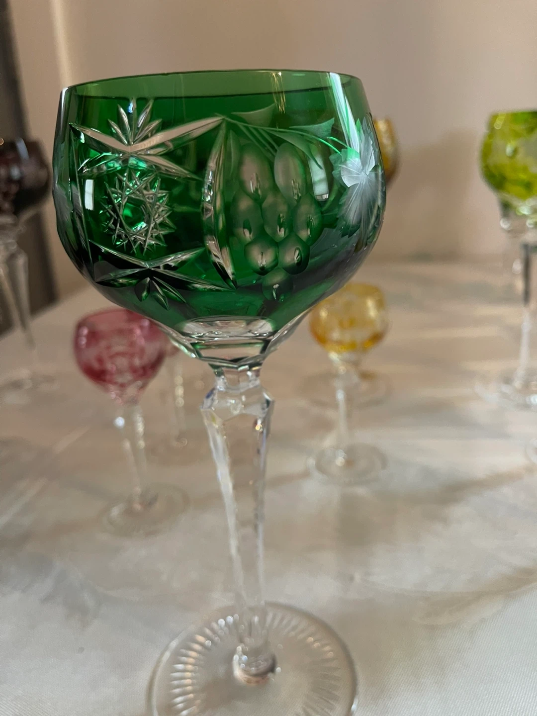 Nachtmann Traube lead crystal glasses in all the colours of the rainbow. Includes 8 wine glasses, 10 cordial glasses, and 2 champagne glasses. All have had minimal use, no chips or scratches to be found. Colours as shown.
