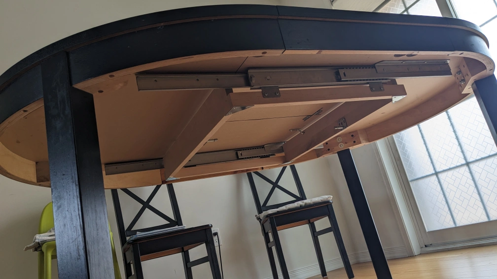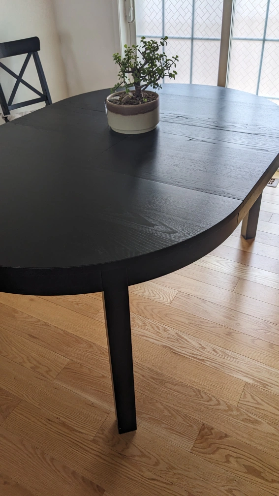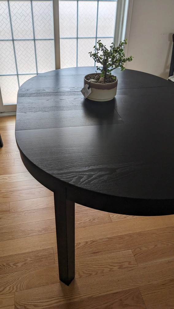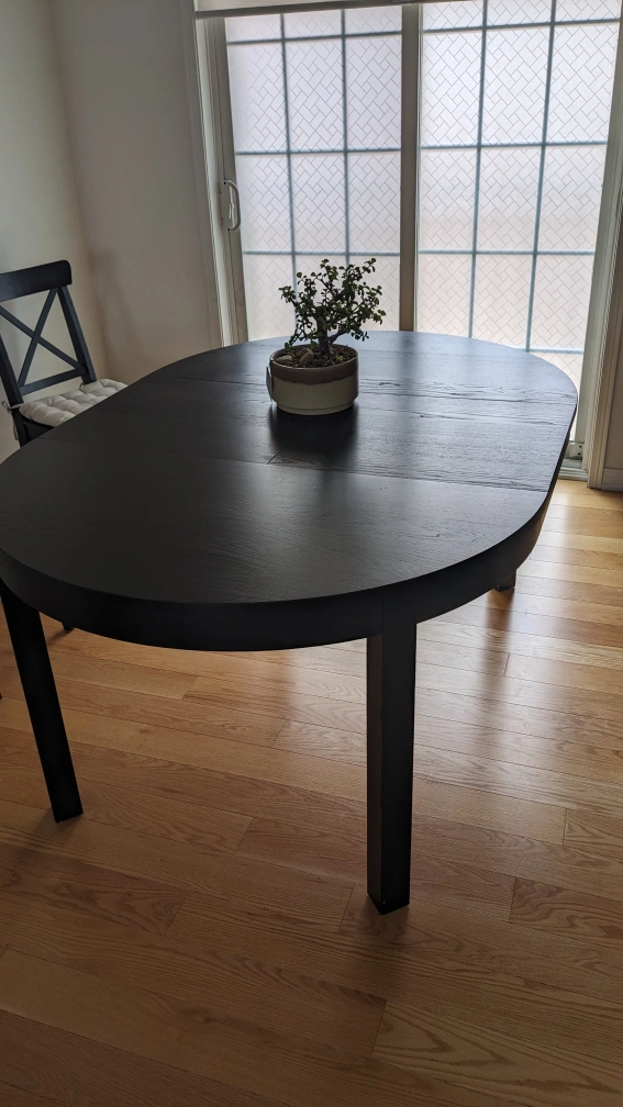 Selling a black dining table that can be extended! It's in as good as new condition. The dimensions are: - 166 cm (65 3/8") extended - 115 cm (45 1/4") unextended - 74 cm (29 1/8") height leaf can be stored inside table can also sell chair for extra charge of 40$ per chair (retails aprox 125$ each with cushion)