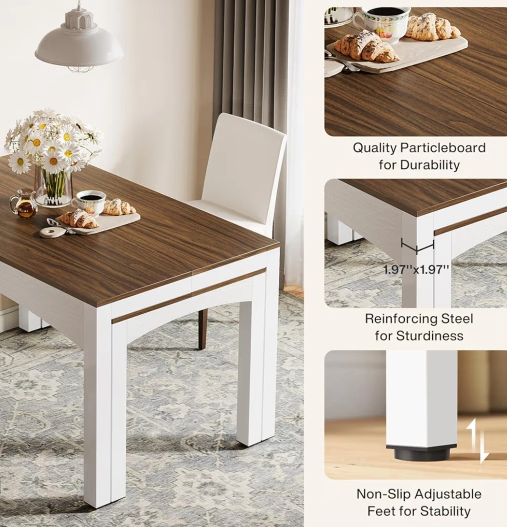 Selling an extendable dining table with a wood-look top and white legs Key features: - Quality particleboard for durability - Reinforcing steel for sturdiness - Non-slip adjustable feet for stability Dimensions: - Small table: 47.24" x 27.36" - Large table: 94.48" x 47.24"