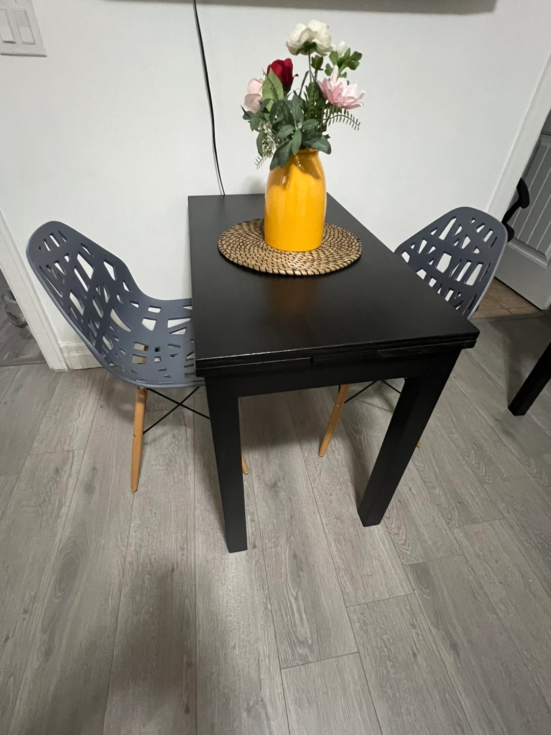 Compact and stylish dining set in great condition. The table easily extends to seat more people — perfect for small apartments or dining areas. Pickup or delivery available (with a small fee).