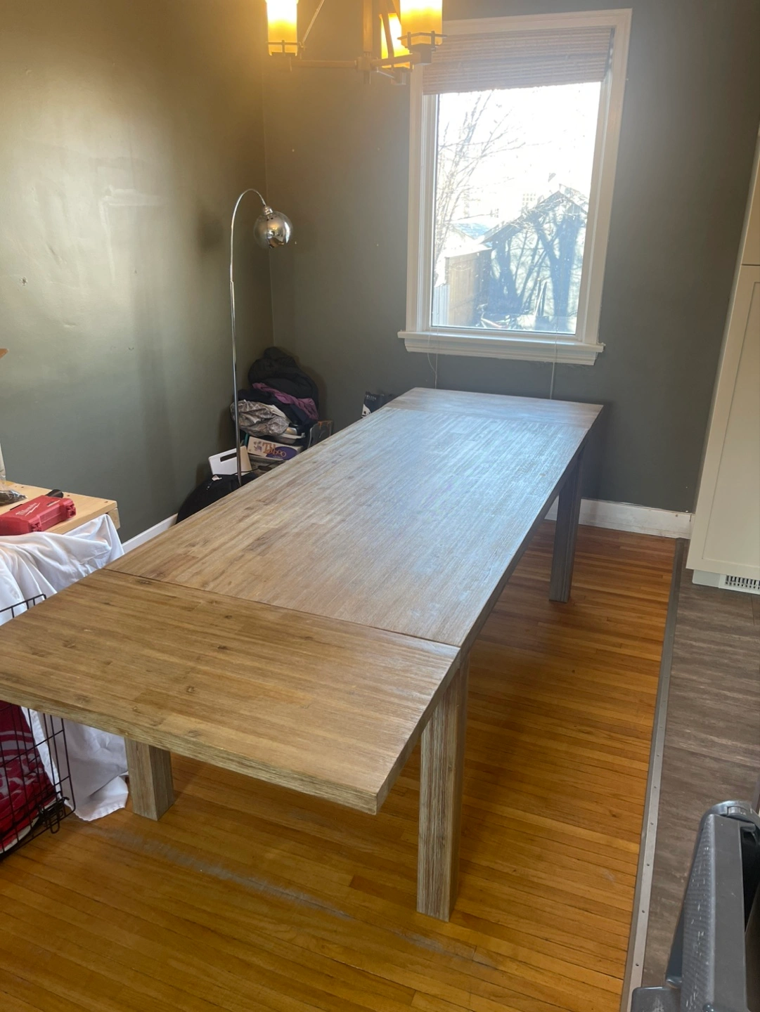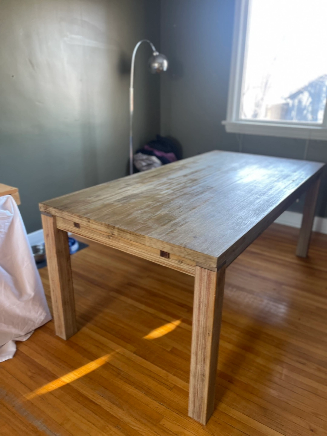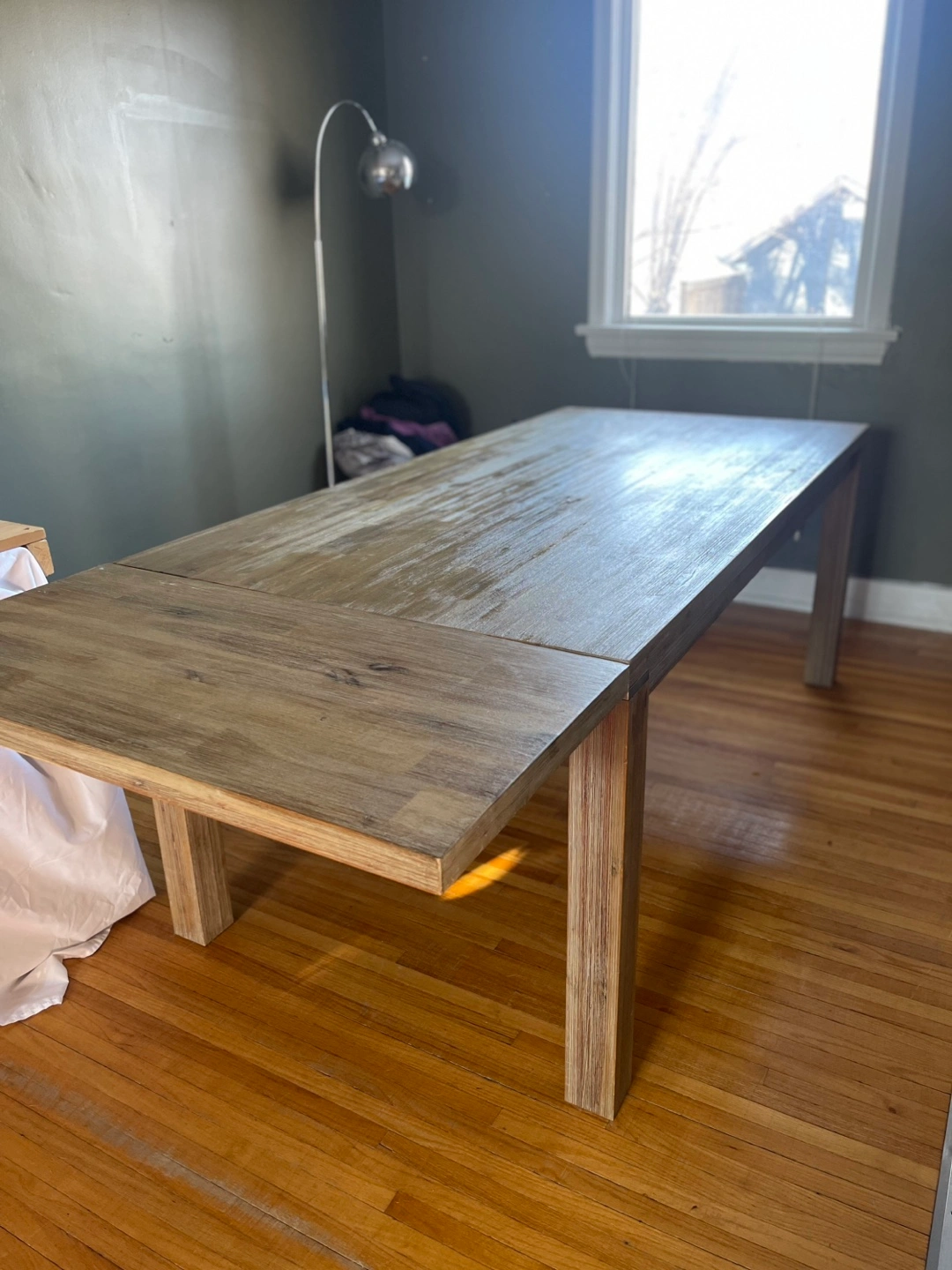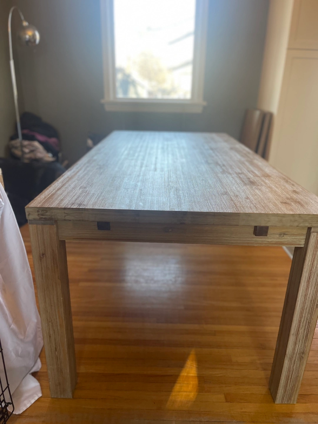 Light coloured wood, rectangular dining table. Features extendable leaves (2). Simple, minimalist design. Solid wood legs. Beautifully designed and in terrific condition. Two leaves are included that attach on each end and remove for easy storage. Moving and it won’t fit in the new place. 6 leather-like dining chairs are included. They are in decent shape but definitely some damage.
