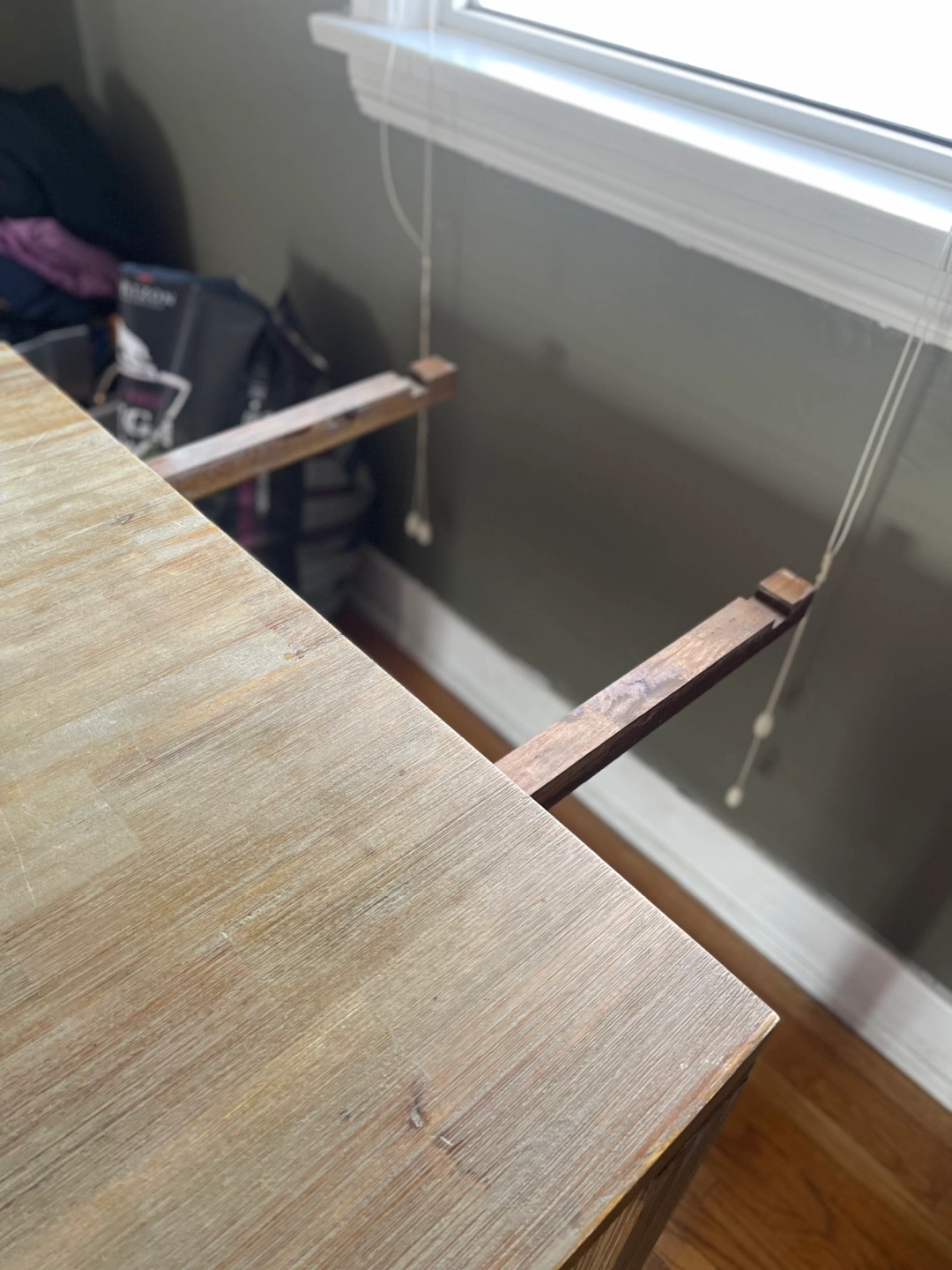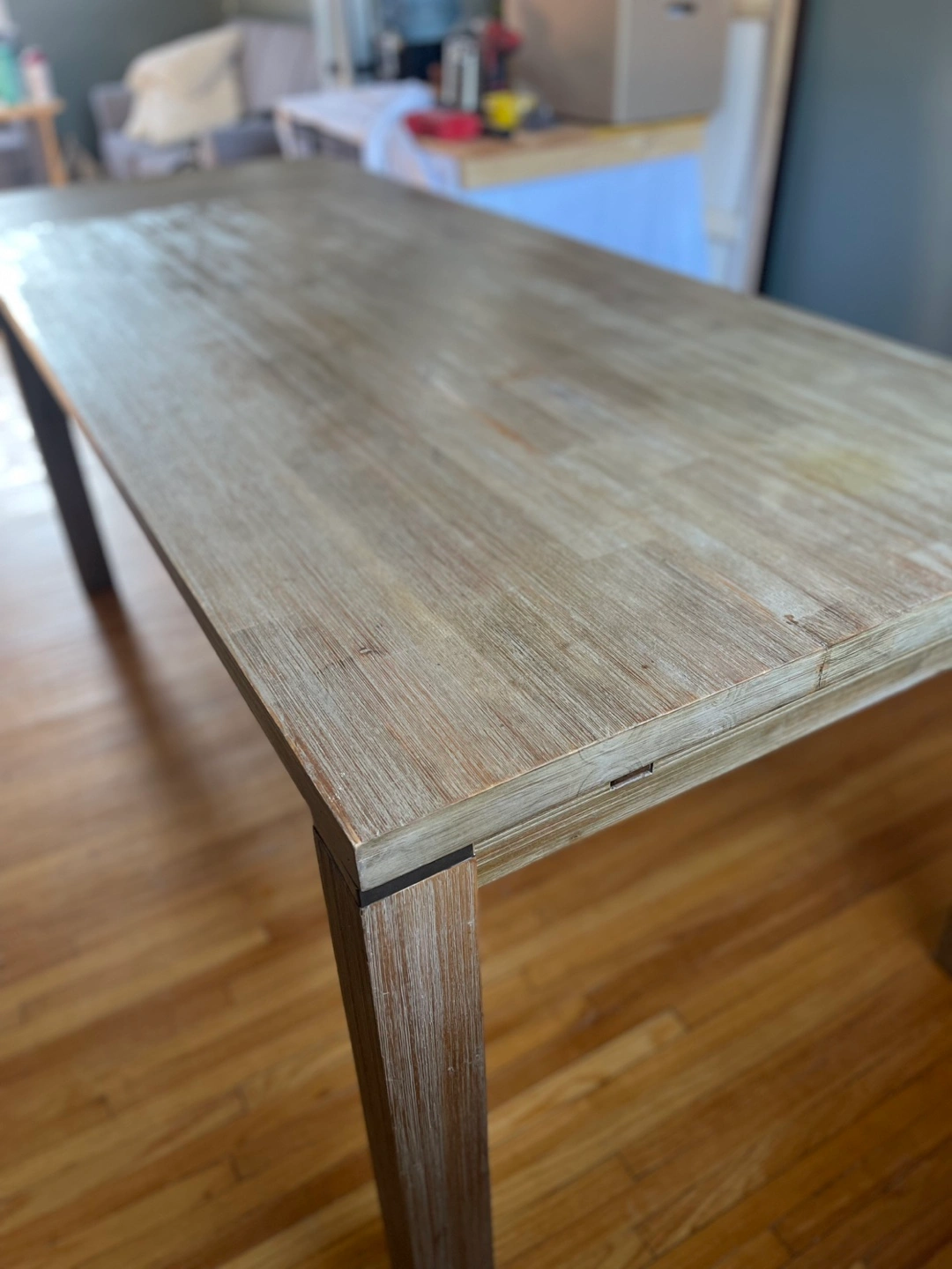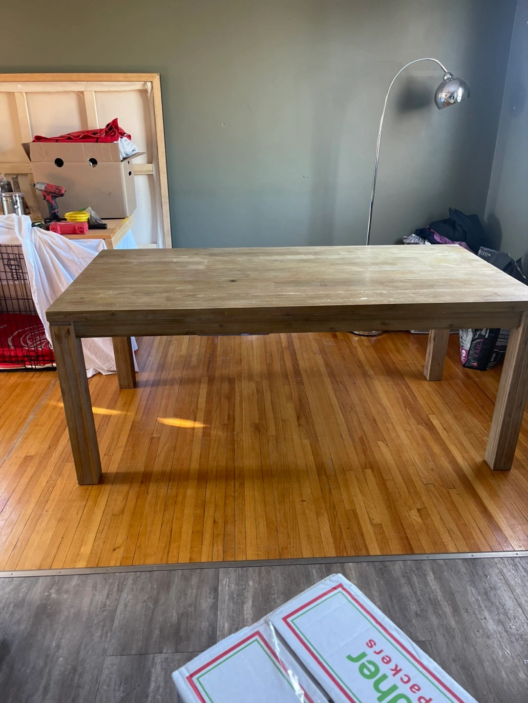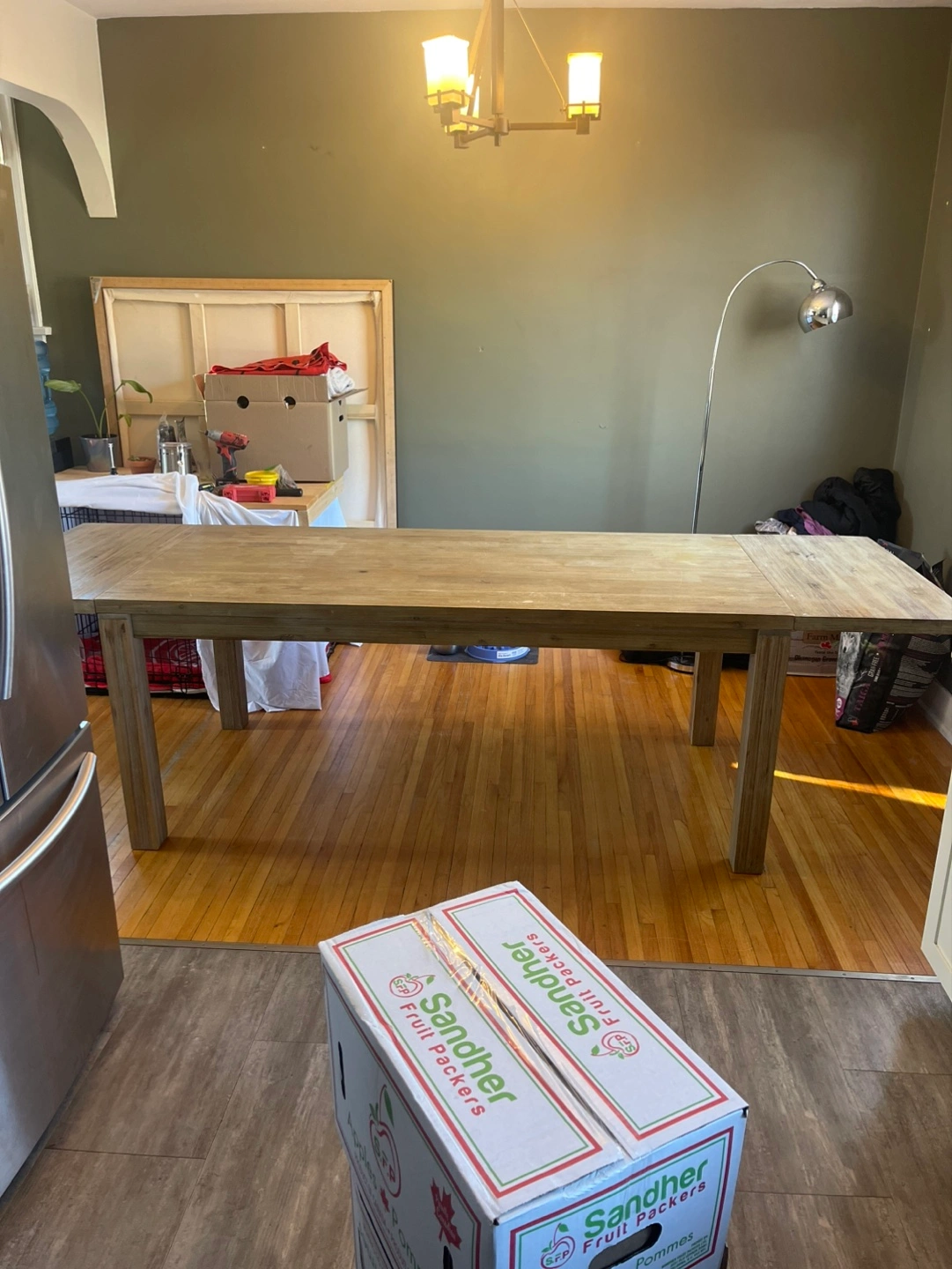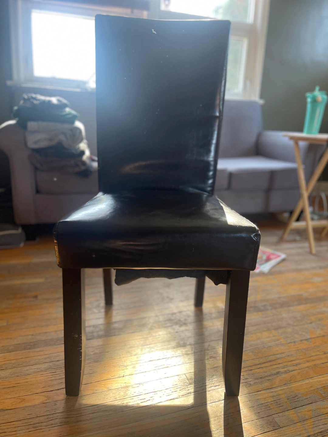 Light coloured wood, rectangular dining table. Features extendable leaves (2). Simple, minimalist design. Solid wood legs. Beautifully designed and in terrific condition. Two leaves are included that attach on each end and remove for easy storage. Moving and it won’t fit in the new place. 6 leather-like dining chairs are included. They are in decent shape but definitely some damage.