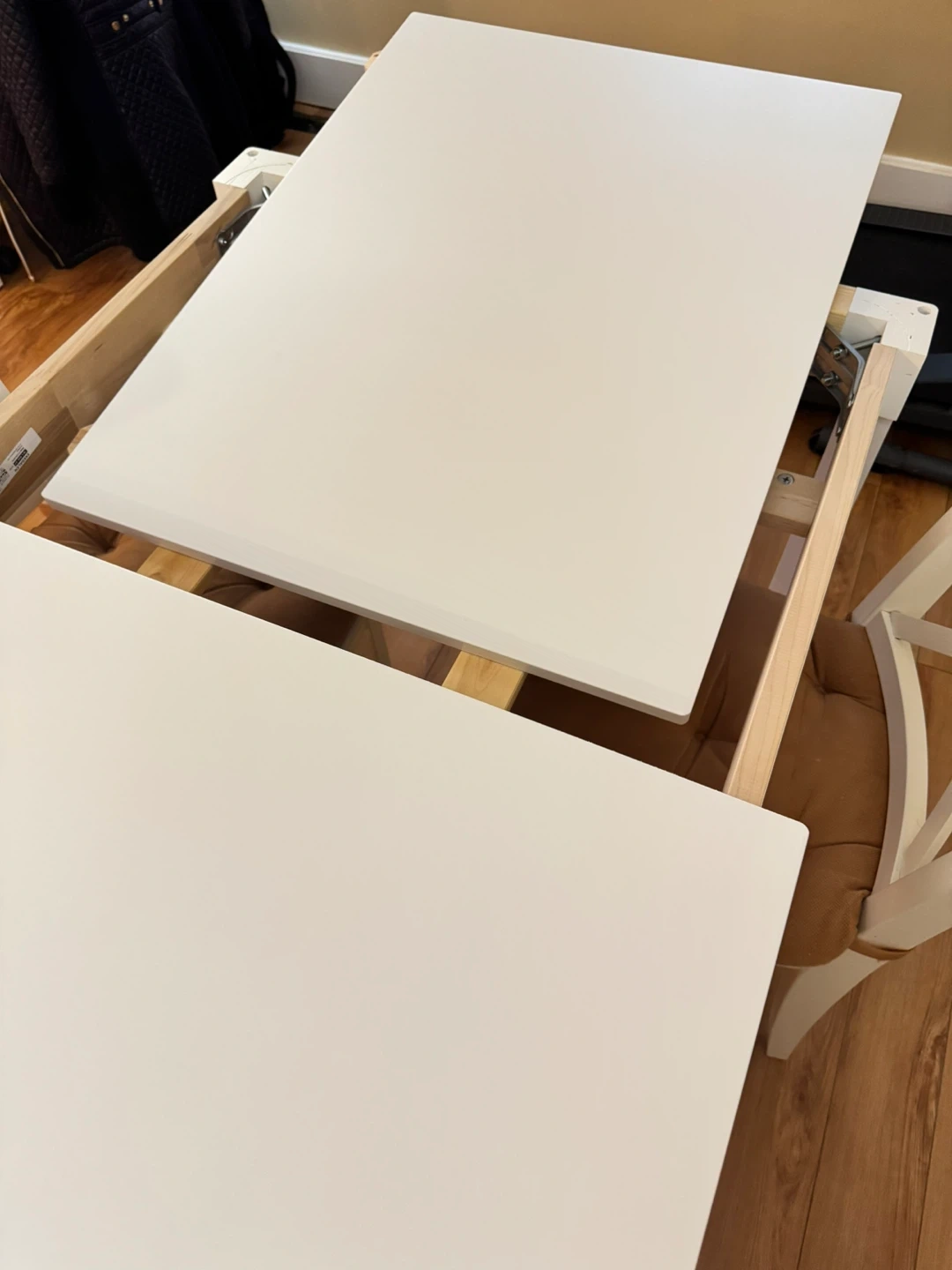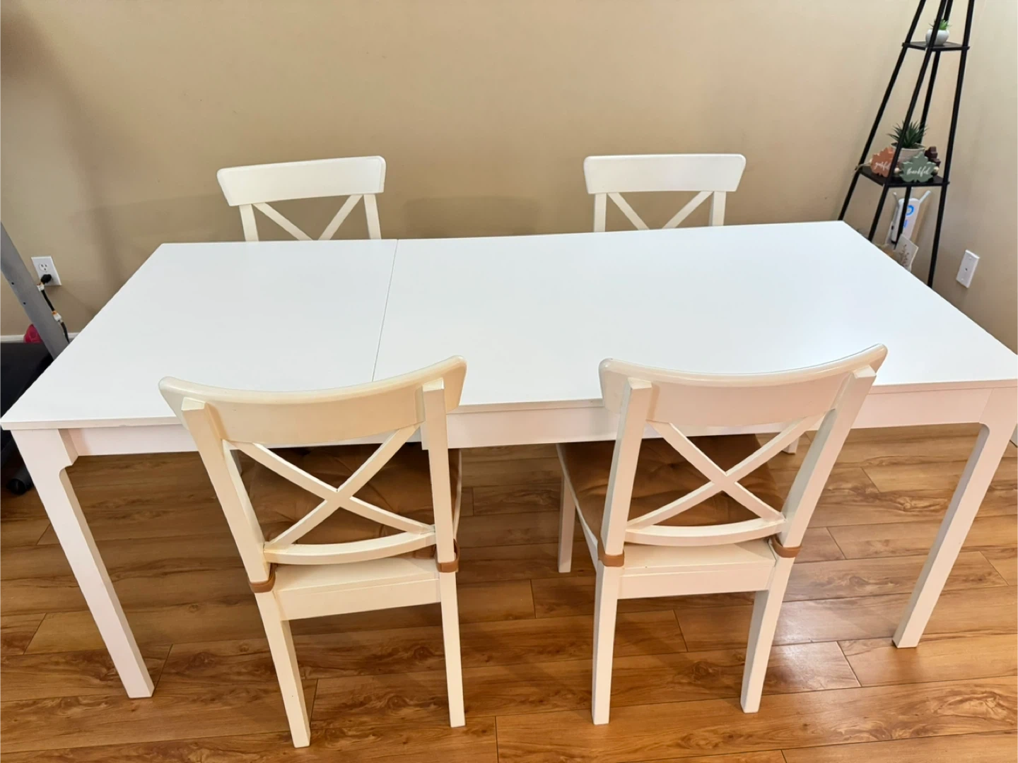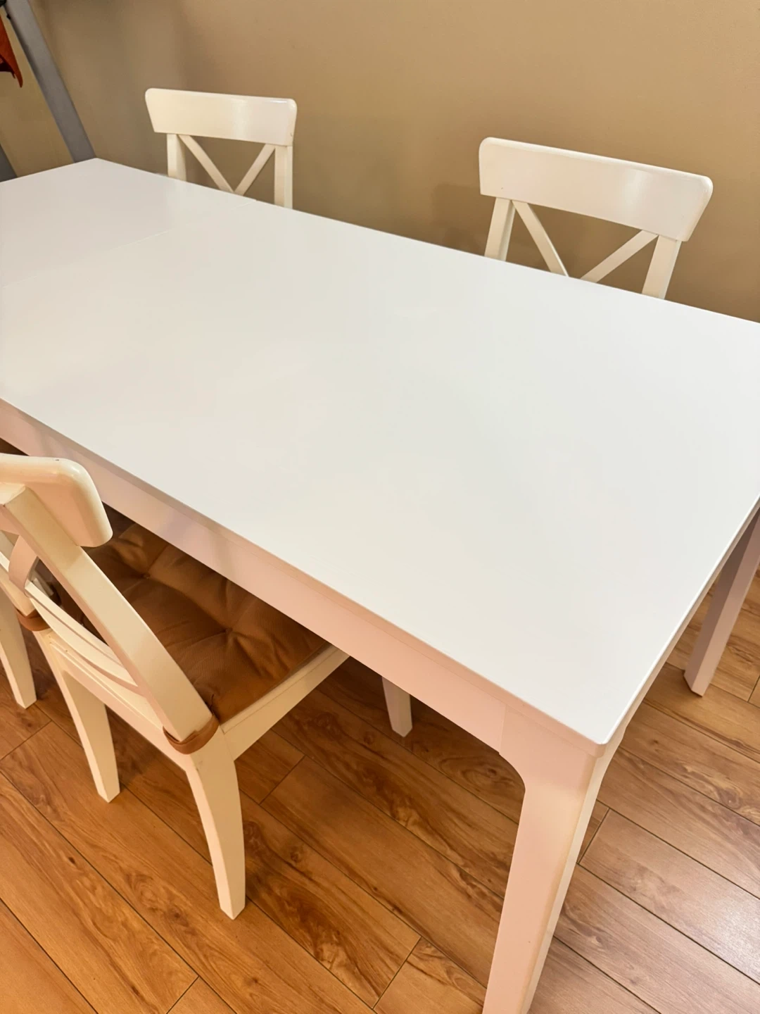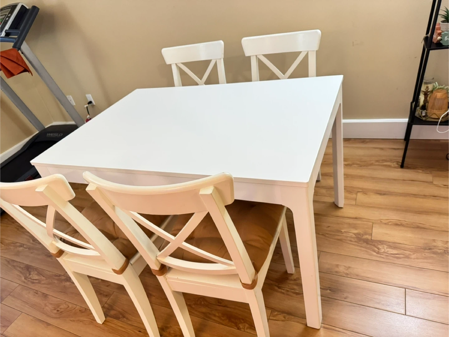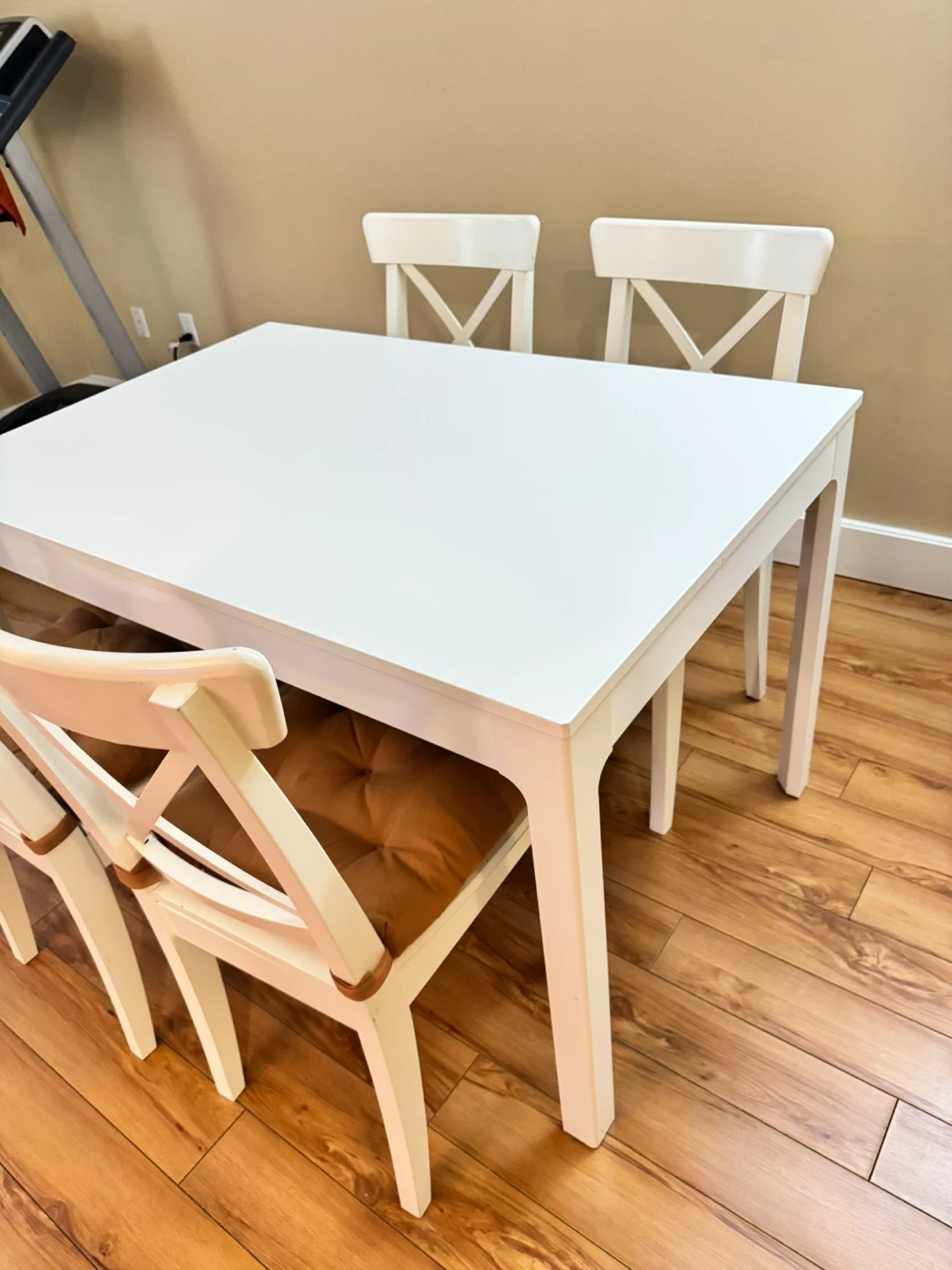22Selling a lovely extendable dining table, perfect for family dinners or gatherings with friends! It comes with four matching chairs. The table is white and in great condition. It's a great addition to any dining space!