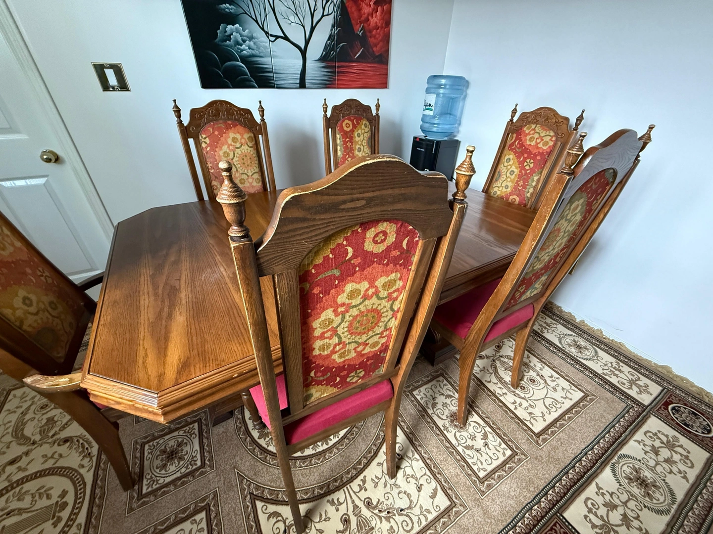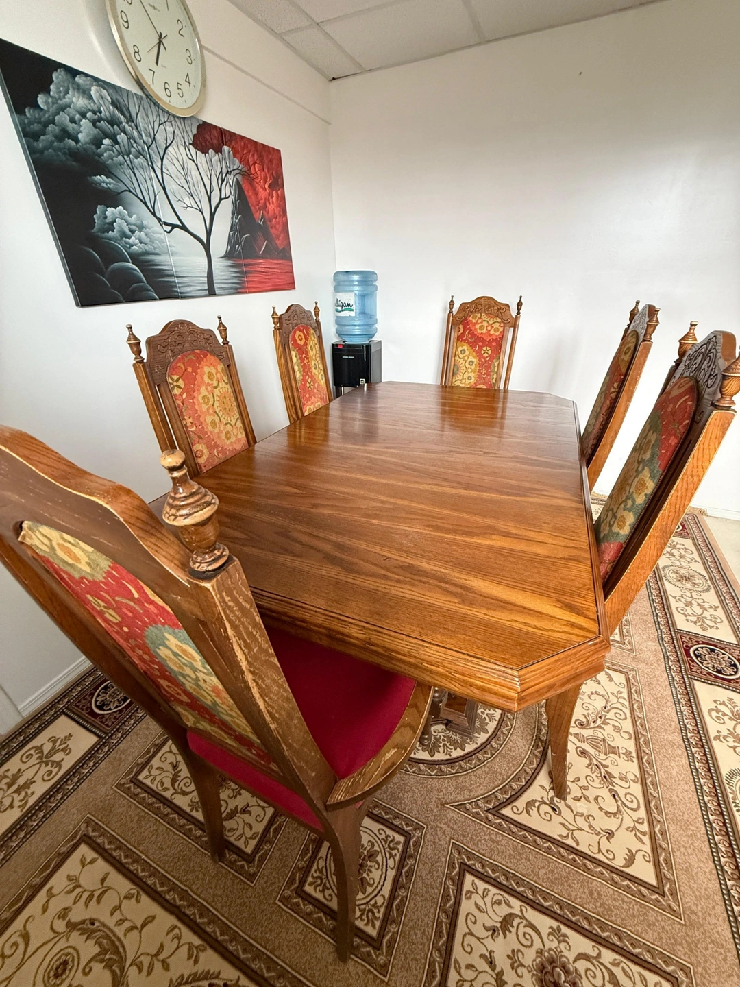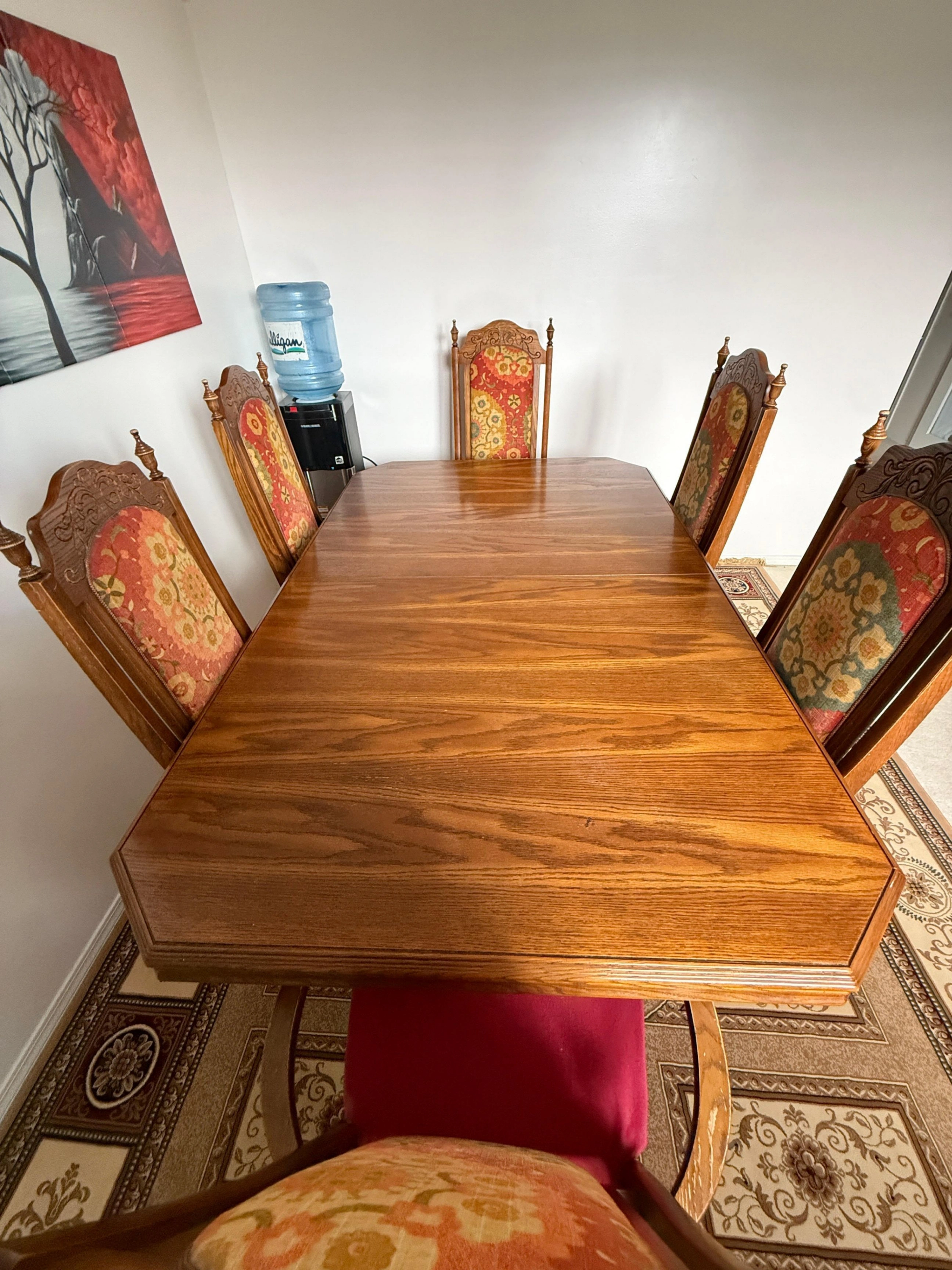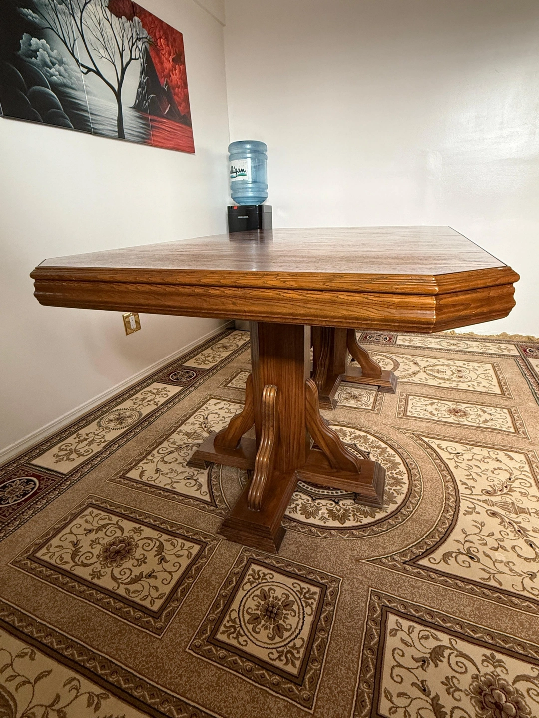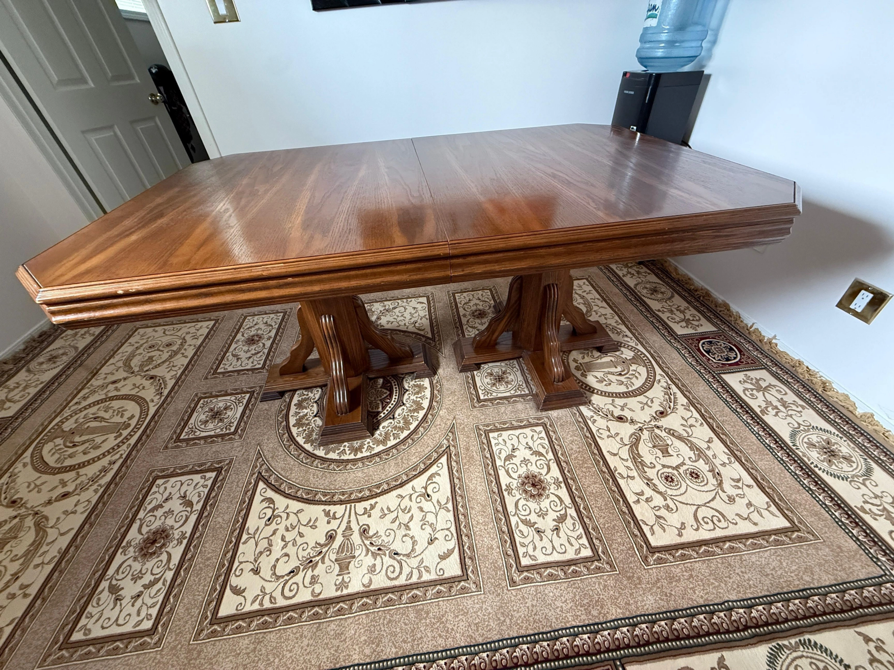 Classic rectangular dining table with a double-pedestal base, crafted from solid wood. Timeless design with an extension that adds about 16", making it versatile for any occasion. Could use a bit of wood polish to refresh its look. Selling because I am moving and can not take it with me. $300 OBO. Size with extension: 66"x42"x34"
