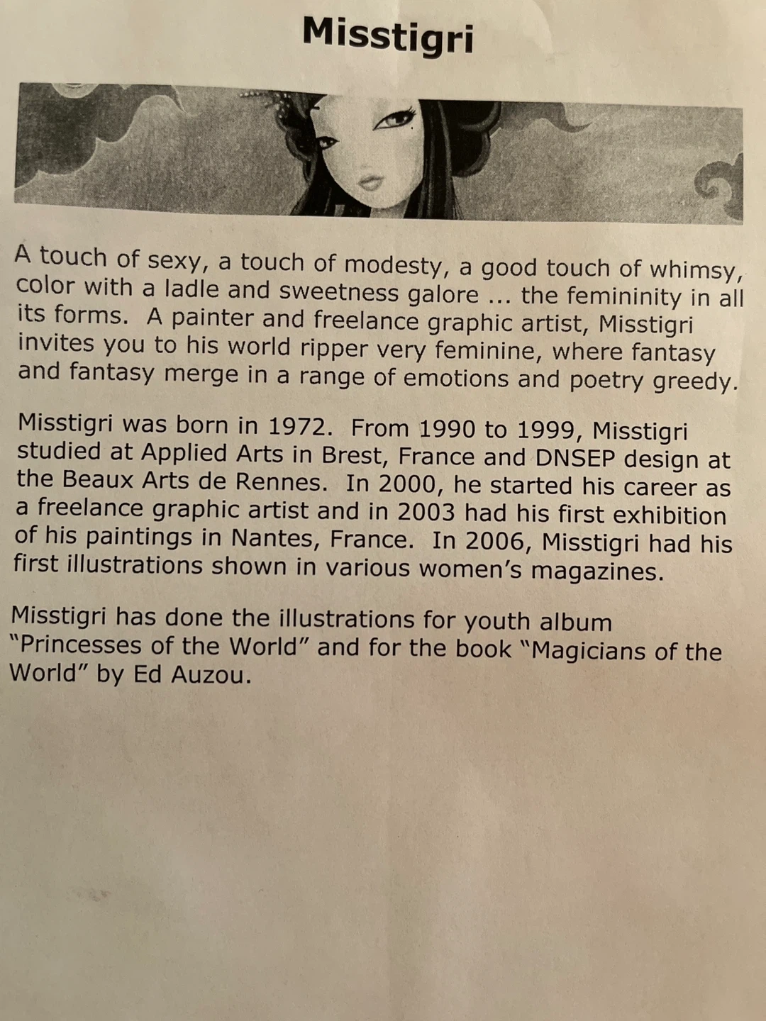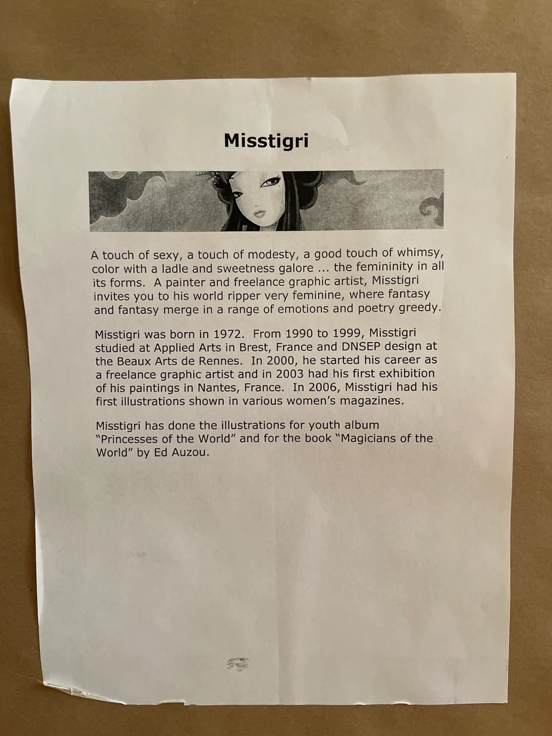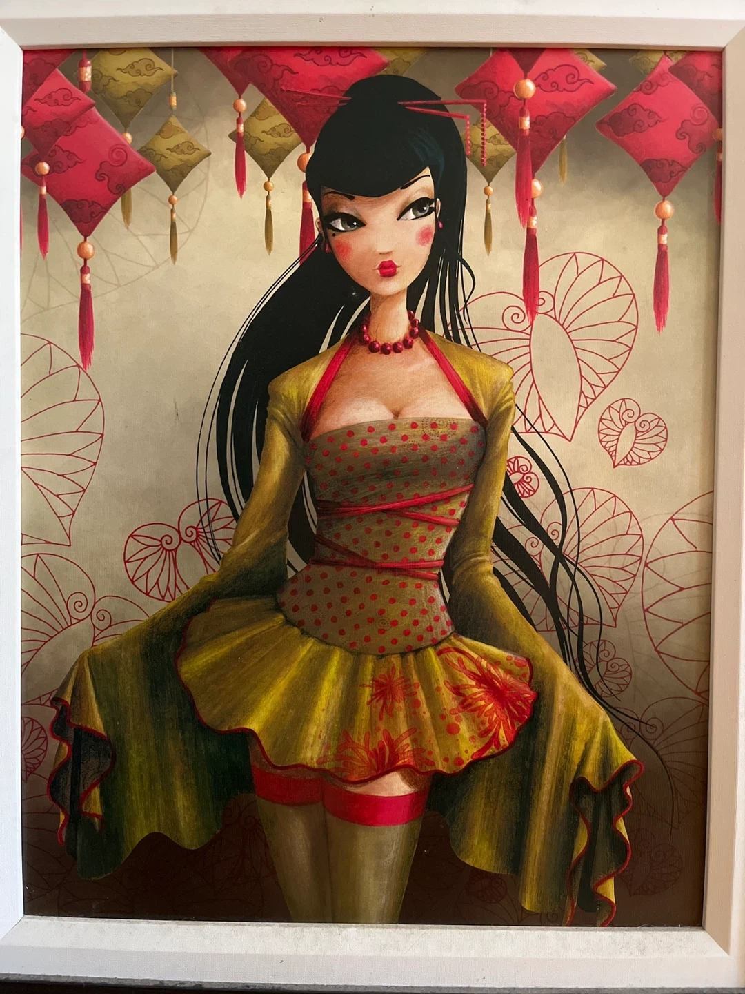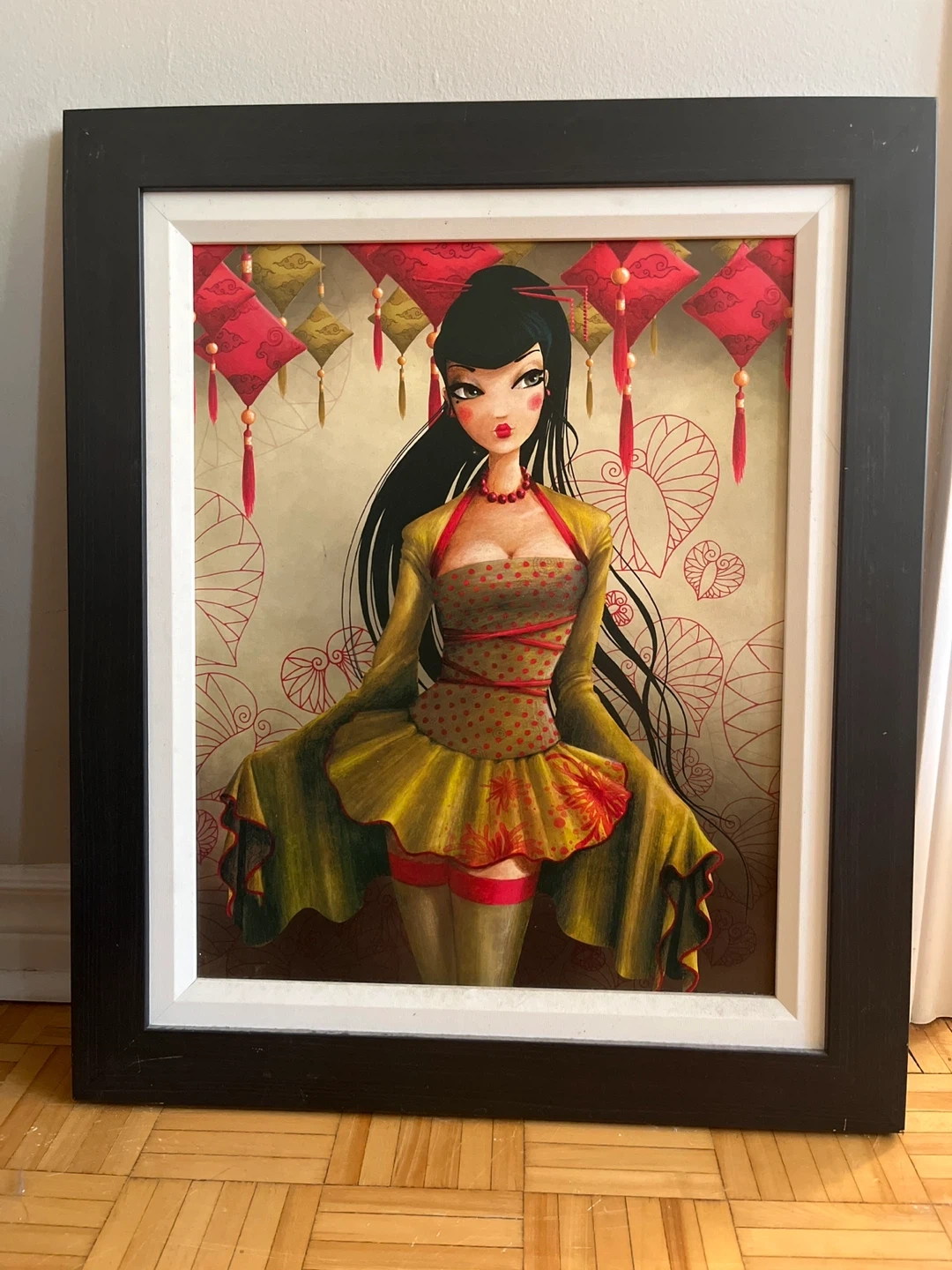 Selling a framed illustration by the artist Misstigri. The illustration features a stylized female figure in a unique and whimsical style. It's framed and ready to hang, adding a touch of artistry to any room. Dark brown frame.