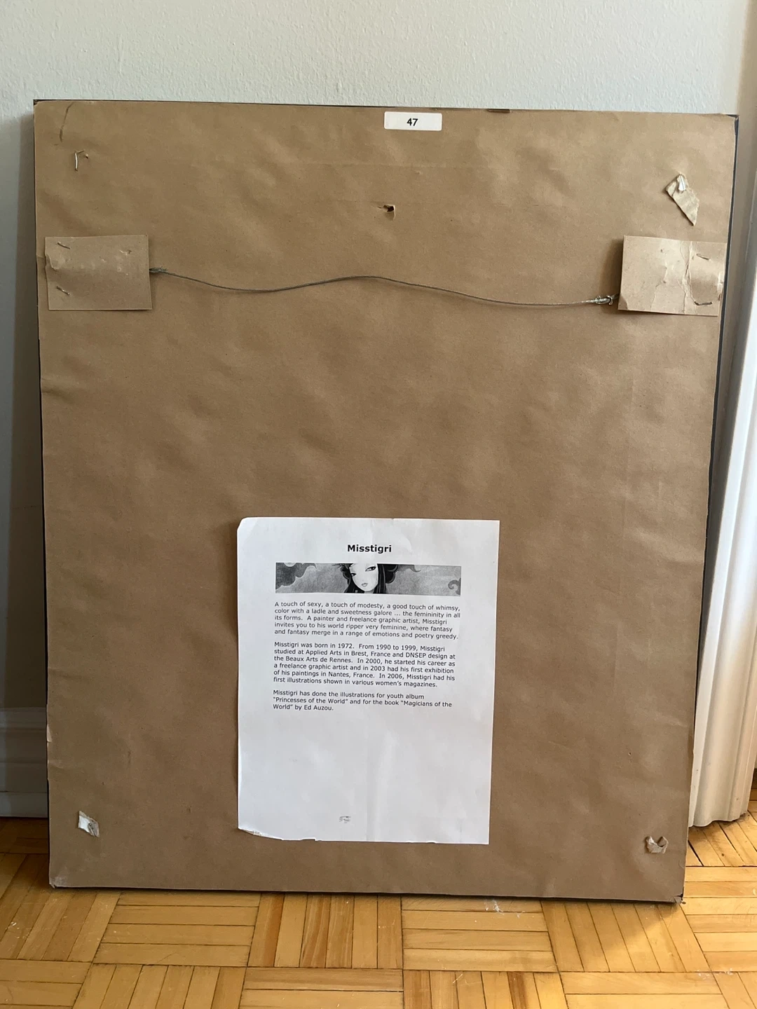 Selling a framed illustration by the artist Misstigri. The illustration features a stylized female figure in a unique and whimsical style. It's framed and ready to hang, adding a touch of artistry to any room. Dark brown frame.