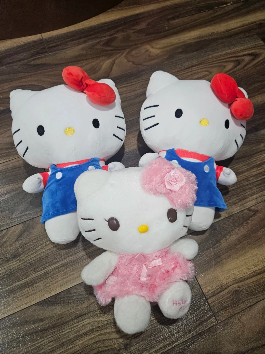 Selling three adorable Hello Kitty plush toys! Two are wearing blue overalls with red bows, and one is wearing a pink dress with a pink flower on its head. They're in great condition and ready for a new home!