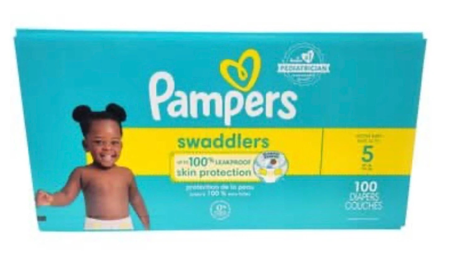Pampers Swaddlers diapers, size 5. Includes 100 diapers for 100% leakproof skin protection. These diapers are pediatrician recommended.