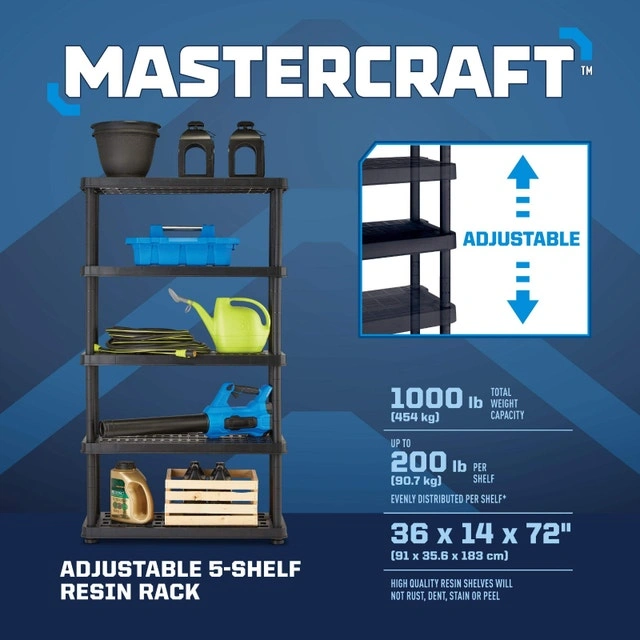 Mastercraft Adjustable 5-Shelf Resin/ Plastic Storage Rack/ Shelving Unit, 36 x 14 x 72-inch. Bought at $49.99 + Tax, selling at $35, OBO. Condition: Used - Like new. For Sale By: Owner.