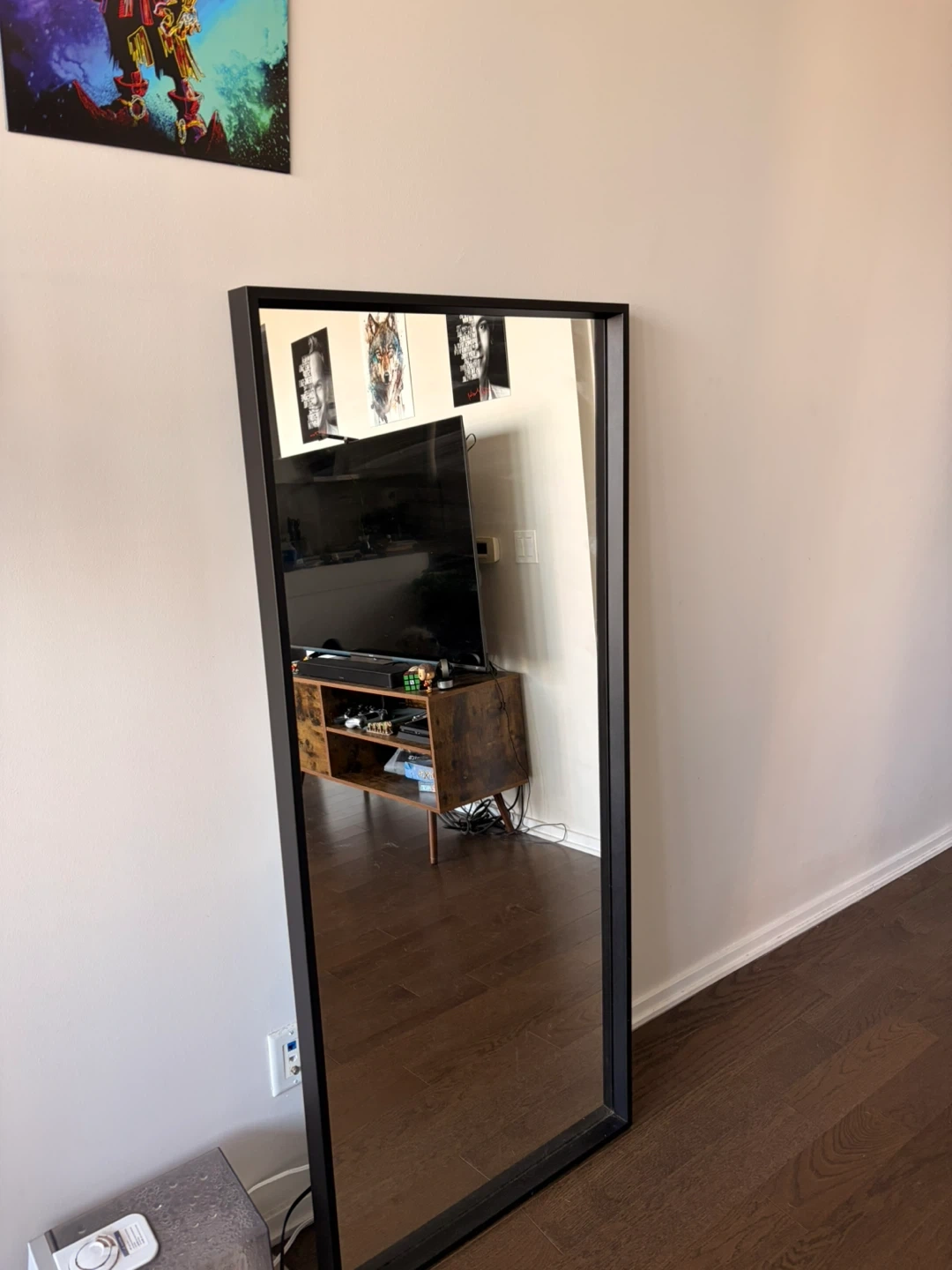 A tall, full-length mirror with a sleek black frame. It's perfect for checking your outfit before heading out! The mirror stands independently and offers a clear reflection.