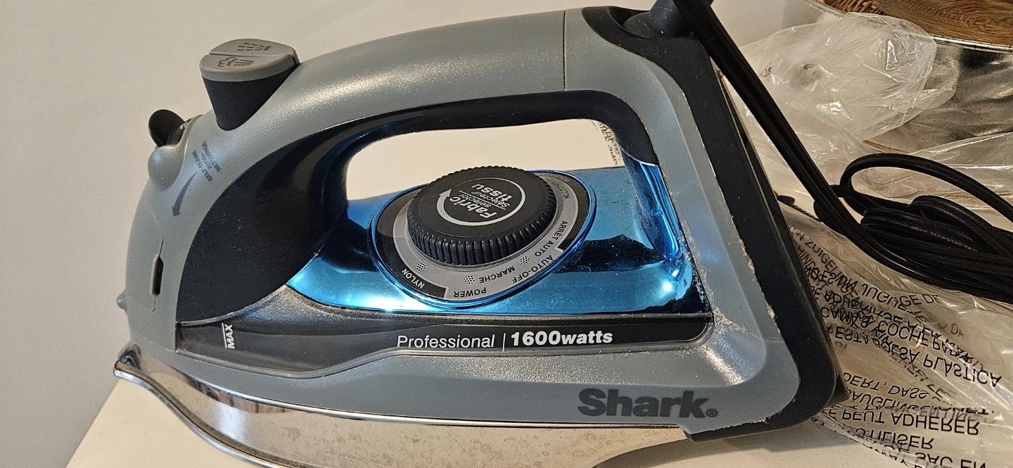 Non working Shark Professional iron offers 1600 watts of power for efficient garment care. It features multiple fabric settings, including nylon, polyester, silk, linen, and cotton. The steam function is ready to use for tackling wrinkles.