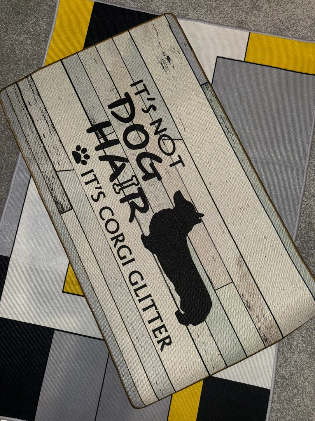 Selling a geometric accent rug and a mat features a fun "It's not dog hair, it's corgi glitter" design with a cute corgi silhouette. It's perfect for adding a touch of personality to your entryway or any room.