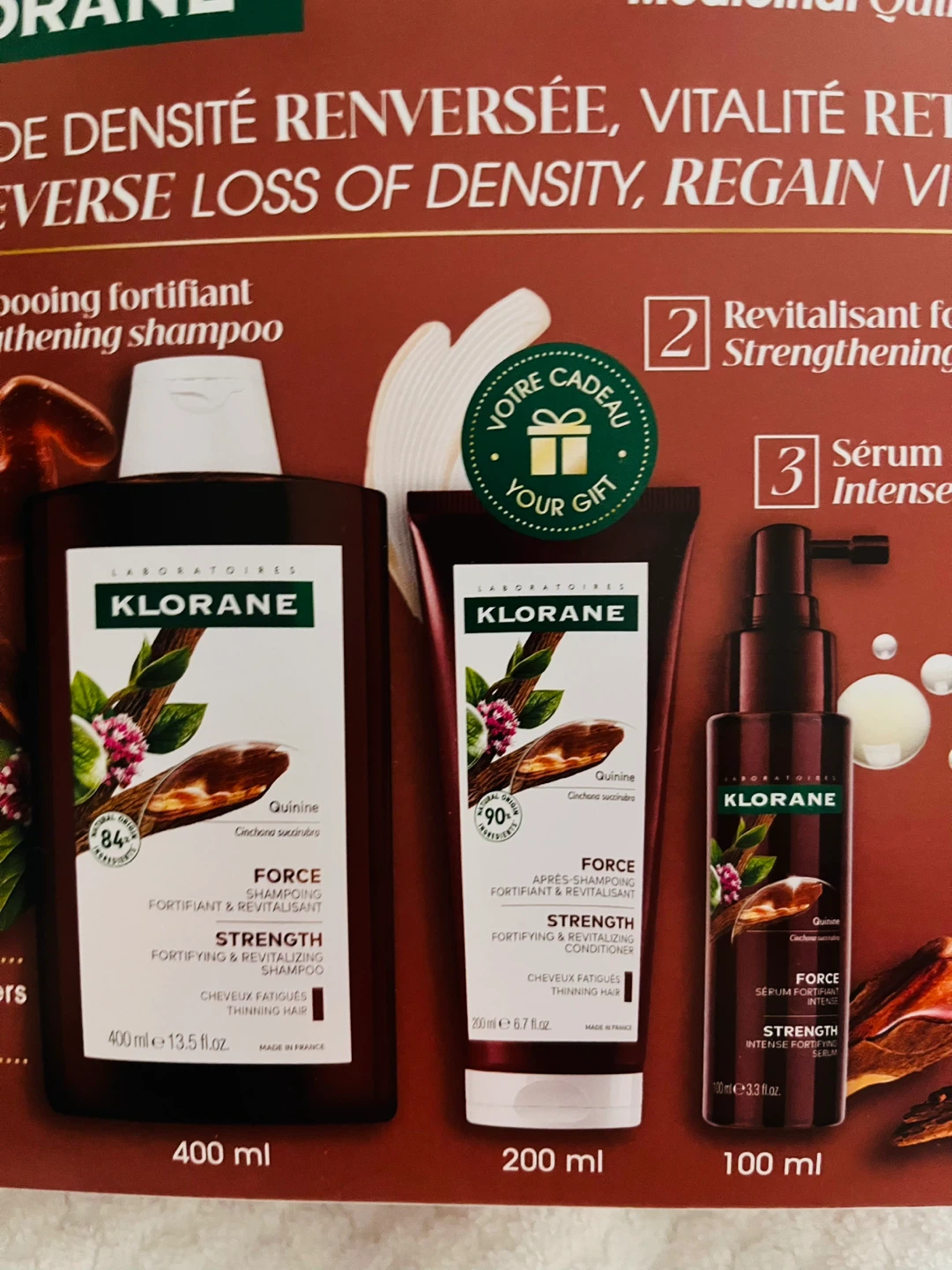 Get the Klorane Quinine Fortifying Hair Ritual set, which includes a fortifying shampoo (400ml), revitalizing conditioner (200ml), and intense fortifying serum (100ml)